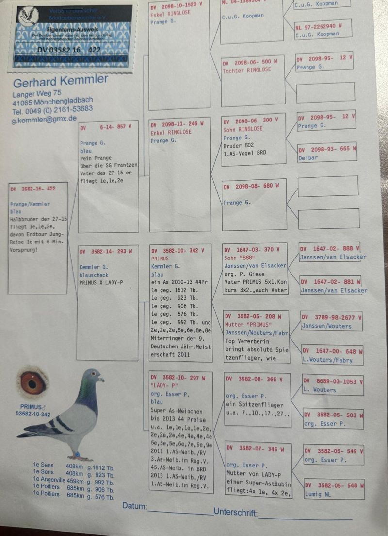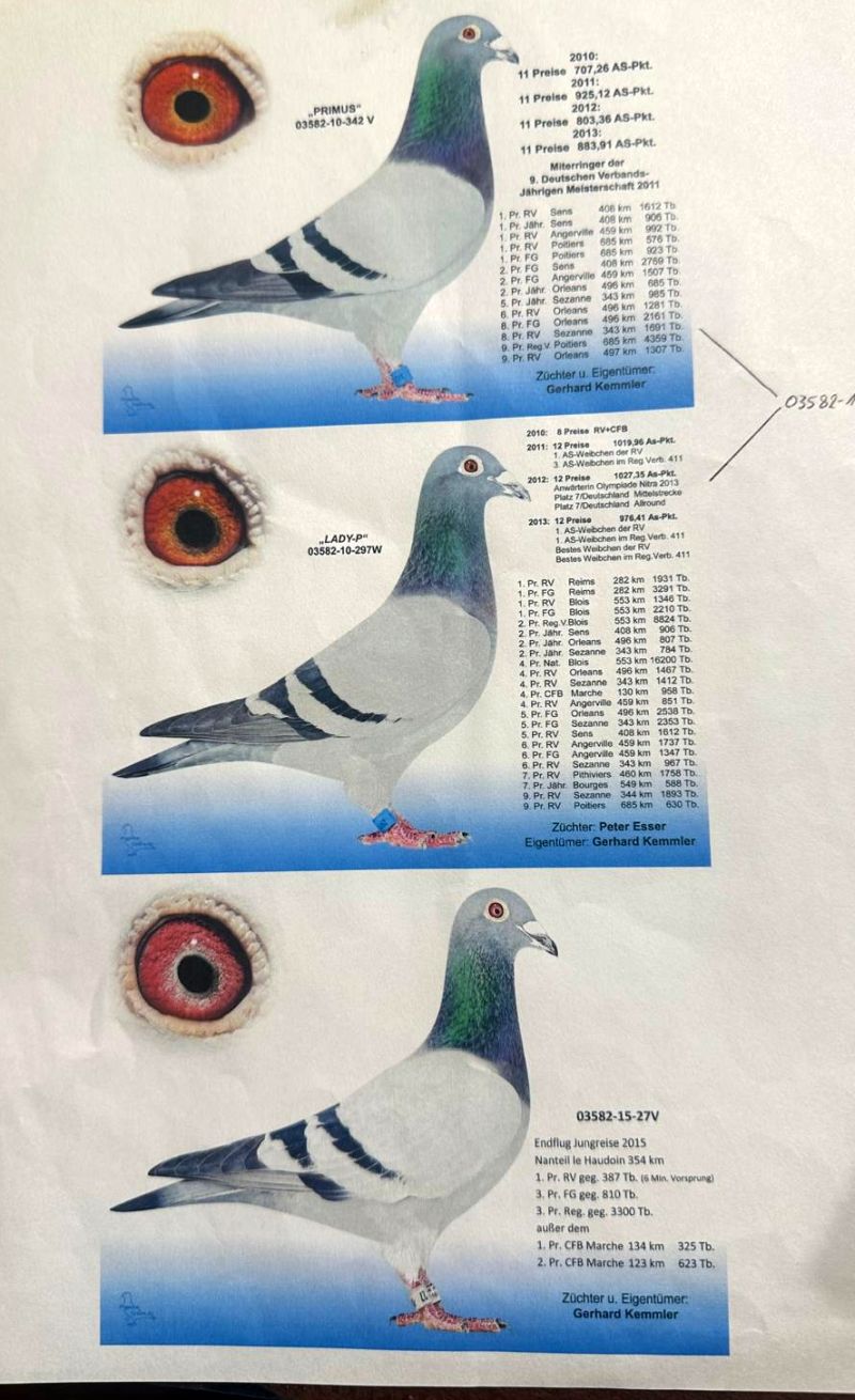 Oryginalny gołąb z hodowli Gerhard Kemmler Szczegóły pochodzenia w rodowodzie. Gołębie po kuracjach, przygotowane do lęgów. Więcej informacji pod numerem telefonu 782 740 221 Wysyłka po uzgodnieniu z prywatnym kurierem, możliwy odbiór na wystawie, ewentualnie odbiór osobisty.