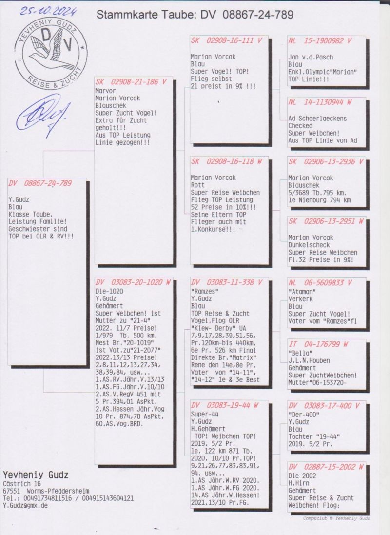Oryginalny gołąb z Hodowli Yevheniy Gudz. Więcej informacji w rodowodzie oraz pod telefonem: 004915143604121 tez WhatsApp (Hodowca mówi po Polsku). Wysylka odbedzie sie z Polski(lub odbiór na Wystawie w Katowicach 9-11 stycznia), koszt wysylki od 100zl, bedzie ustalona indywidualnie...Prosze licytowac w 100% pewnosci zakupu!!!