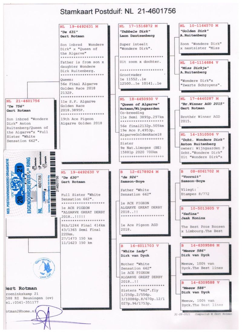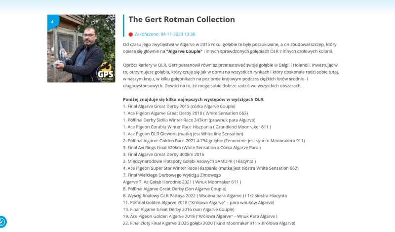 Oryginalny gołąb z hodowli Gert ROTMAN. Szczegóły pochodzenia w rodowodzie. Gołąb gotowy do sezonu lęgowego, zaszczepiony przeciwko paramyksowirozie (Columba) i salmonellozie (Salmo PT). Więcej informacji pod nr tel.: 506 123 808. Wpłata za gołębia na konto po zakończeniu aukcji. Możliwy odbiór osobisty lub dostawa realizowana przez kuriera w cenie 160 zł. Możliwy także odbiór na wystawie Ogólnopolskiej w Katowicach (sobota lub niedziela). *** CENA STARTOWA 500 zł. ***