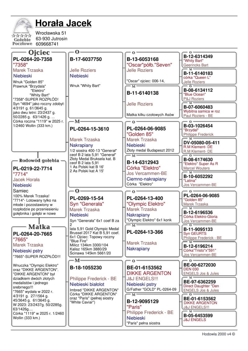 Oryginalny gołąb z hodowli Jacek Horała. Szczegóły pochodzenia w rodowodzie. Odbiór osobisty lub na Wystawie Ogólnopolskiej. Ewentualna wysyłka - proszę o kontakt telefoniczny przed zalicytowaniem. Więcej informacji pod nr tel.: +48 609 668 741
