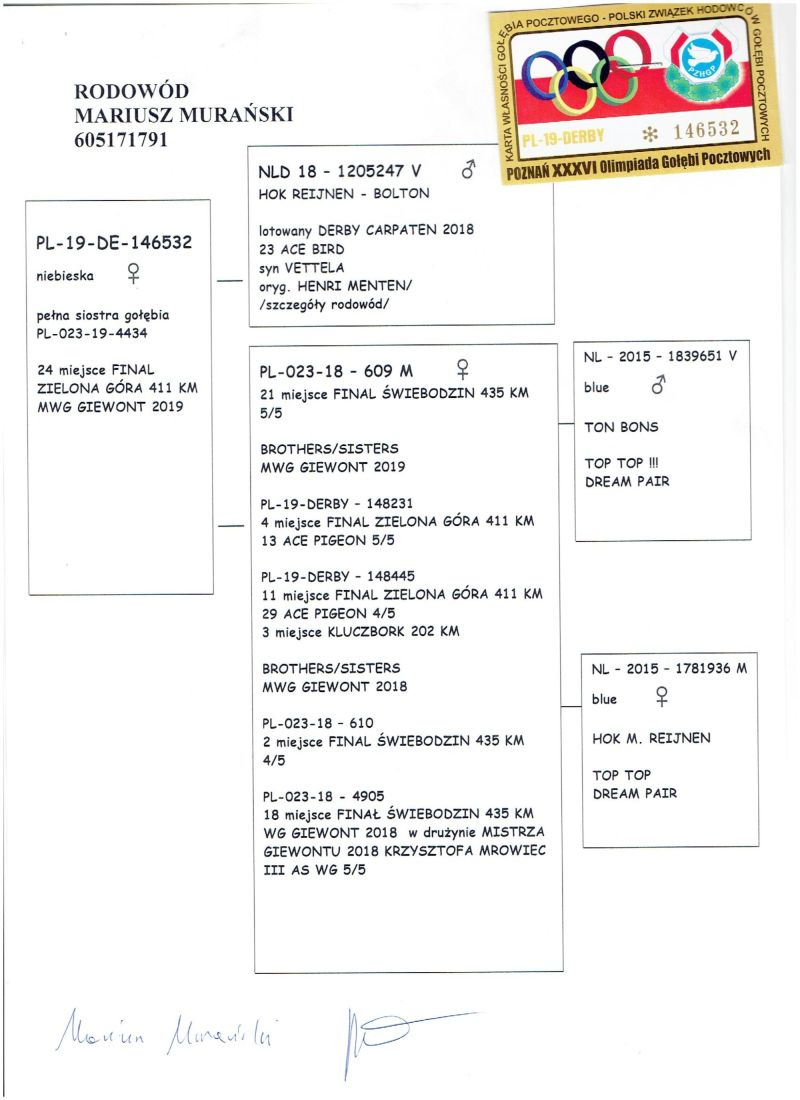 Oryginalny gołąb z hodowli Tadeusza Gierczaka. Szczegóły pochodzenia w rodowodzie. Gołąb gotowy do sezonu lęgowego, zaszczepiony przeciwko paramyksowirozie (Columba) i salmonellozie (Salmo PT). Więcej informacji pod nr tel.: 669 404 144. Wpłata za gołębia na konto po zakończeniu aukcji. Możliwy odbiór osobisty lub dostawa realizowana przez kuriera w cenie 160 zł. Możliwy także odbiór na wystawie Ogólnopolskiej w Katowicach (sobota lub niedziela). *** CENA STARTOWA 500 zł. ***