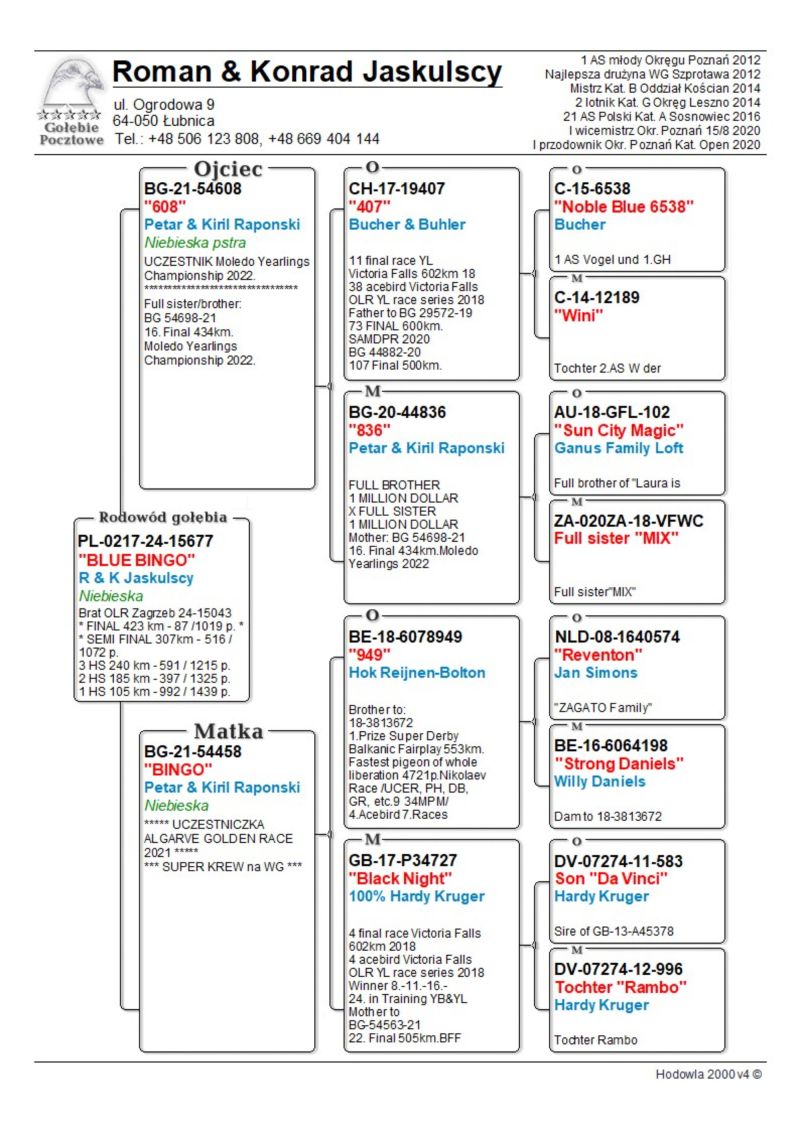 Oryginalny gołąb z hodowli Roman & Konrad Jaskulscy. Szczegóły pochodzenia w rodowodzie. Gołąb gotowy do sezonu lęgowego, zaszczepiony przeciwko paramyksowirozie (Columba) i salmonellozie (Salmo PT). Więcej informacji pod nr tel.: 506 123 808. Wpłata za gołębia na konto po zakończeniu aukcji. Możliwy odbiór osobisty lub dostawa realizowana przez kuriera w cenie 160 zł. Możliwy także odbiór na wystawie Ogólnopolskiej w Katowicach (sobota lub niedziela).