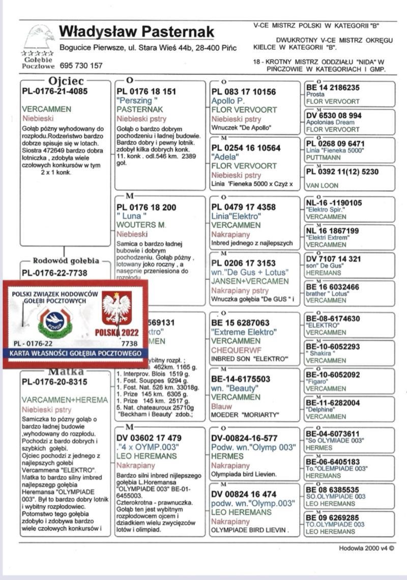 Oryginalny gołąb z hodowli Władysława Pasternaka. Szczegóły pochodzenia w rodowodzie. Więcej informacji pod nr tel.: 728 218 882 *Możliwość wysyłki