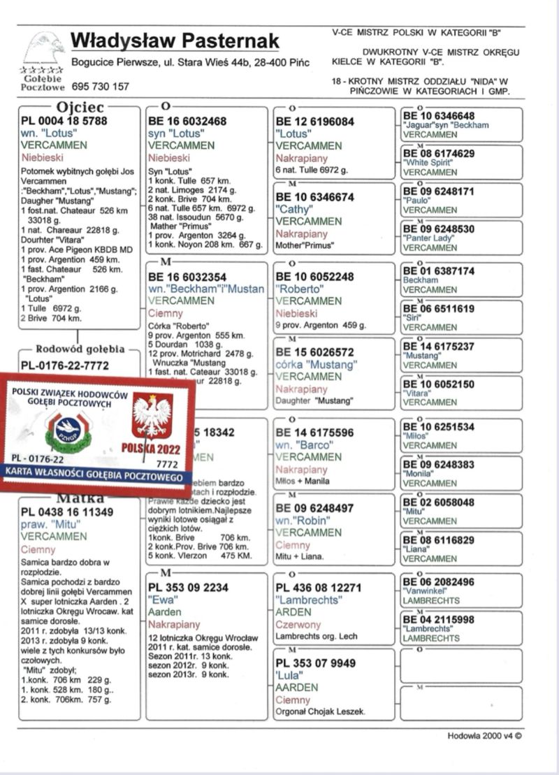 Oryginalny gołąb z hodowli Władysława Pasternaka. Szczegóły pochodzenia w rodowodzie. Więcej informacji pod nr tel.: 728 218 882 *Możliwość wysyłki