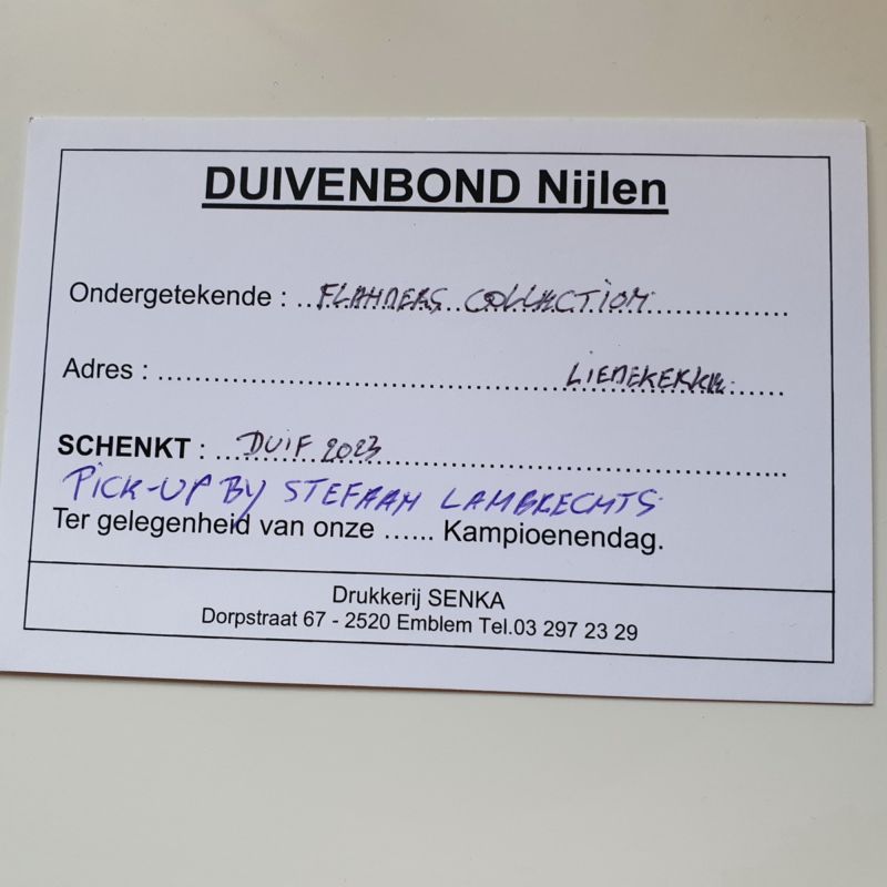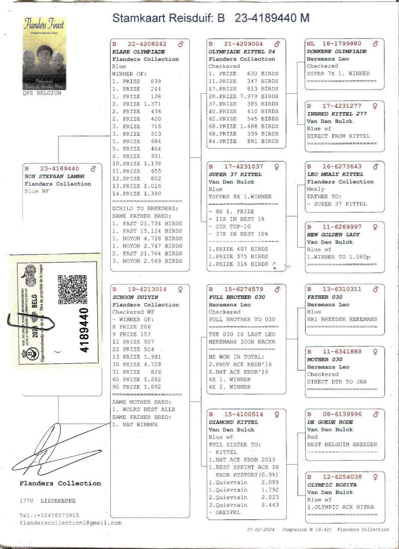 Samiec ze słynnej hodowli Flanders Collection. Gołąb był bonem dla klubu Stefaana Lambrechtsa i od niego odebrany. Samczyk z najlepszych gołębi Van Den Bulck i Leo Heremans. Szczegóły pochodzenia w rodowodzie lub pod nr. tel. 696 241 555
