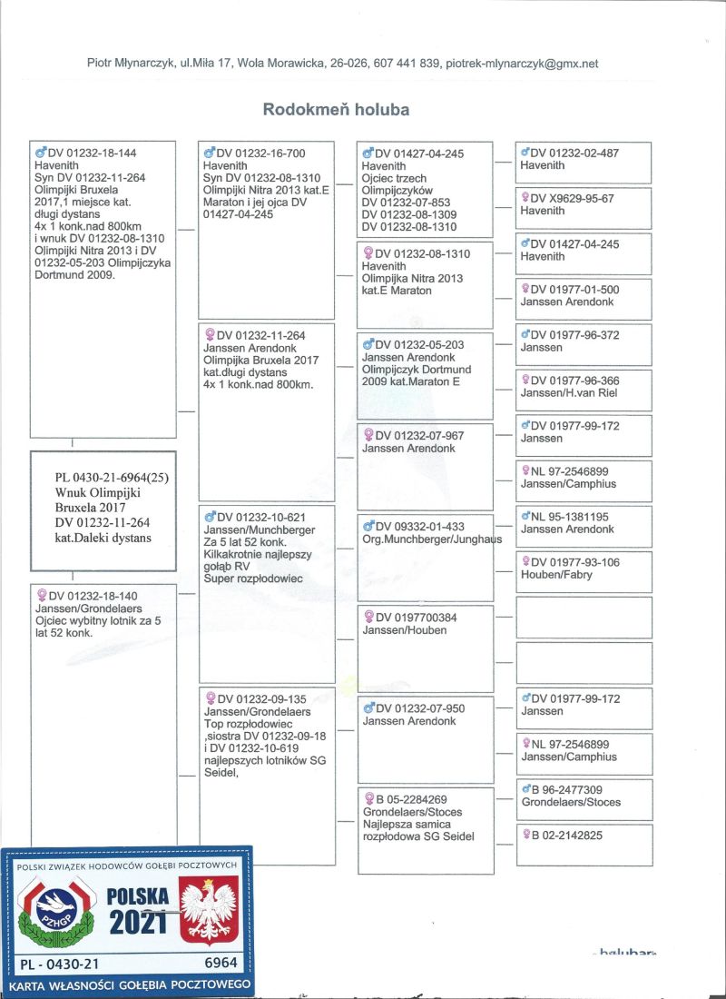 Havenith , gołąb dalekodystansowy. Wnuk (wnuczka)Olimpijki Bruksela 2017 kat.E daleki dystans DV 01232-11-264, m.in. zdobyła 4x 1 konk. na odległości nad 800 km.Rodzina Seidel posiada siedmiu Olimpijczyków w kategorii daleki dystans, m.in. DV 01232-15-306 Olimpijka z Oradea 2022, pierwszy gołąb niemiec i 17 świata. Gołąbki zaszczepione msv i odrobaczone. Transport gołębi kurierem po wcześniejszym uzgodnieniu,odbiór osobisty albo w Niedzielę na wystawie w Katowicach.