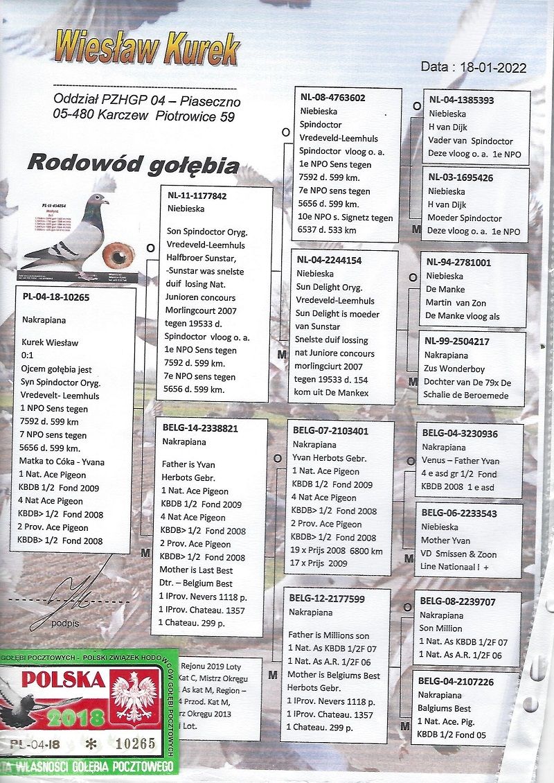 Oryginalny gołąb z hodowli Wiesława Kurka Szczegóły pochodzenia w rodowodzie. Więcej informacji pod nr tel.: 782-667-476. Przesyłka kurierem, koszt: 1 gołąb 120 zł, 2-3 gołębie 150 zł.