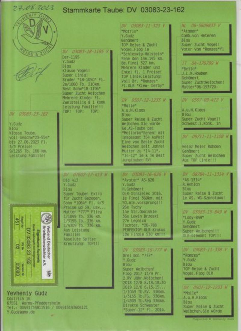 Oryginalny gołąb z Hodowli Yevheniy Gudz. Więcej informacji w rodowodzie oraz pod telefonem: 004915143604121 tez WhatsApp (Hodowca mówi po Polsku). Wysylka odbedzie sie z Polski(lub odbiór na Wystawie w Katowicach 9-11 stycznia), koszt wysylki od 100zl, bedzie ustalona indywidualnie...Prosze licytowac w 100% pewnosci zakupu!!!