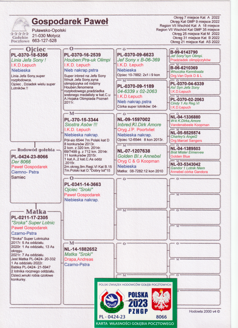 Prezentowane przeze mnie na aukcji gołąbki są zdrowe i w 100% przygotowane do dalszej hodowli. Szczegóły pochodzenia gołębia w rodowodzie. Moje wyniki 2025 na szczeblu oddziału. Gołębie dorosłe: Super Mistrzostwo Oddziału - I Vice Mistrz, 5 z 50- II Vice Mistrz, 5 z całości - II Vice Mistrz, Typowane - II Vice Mistrz, KAT. A - I Vice Mistrz, KAT. B - II Przodownik, KAT. C - I Vice Mistrz, KAT. M -I Vice Mistrz, KAT.D - I Vice Mistrz, KAT. GMP - II Vice Mistrz, KAT. ROCZNE - I Vice Mistrz, KAT. ROCZNE COEFF - I Vice Mistrz. Transport prywatnym kurierem kwota ok 150zł pokrywa kupujący. Istnieje również inna forma dostarczenia gołąbka która będzie ustalana indywidualnie z kupującym. Możliwy również odbiór osobisty lub na wystawie Ogólnopolskiej. Więcej informacji na temat gołębi i transportu pod nr tel. 663-127-528