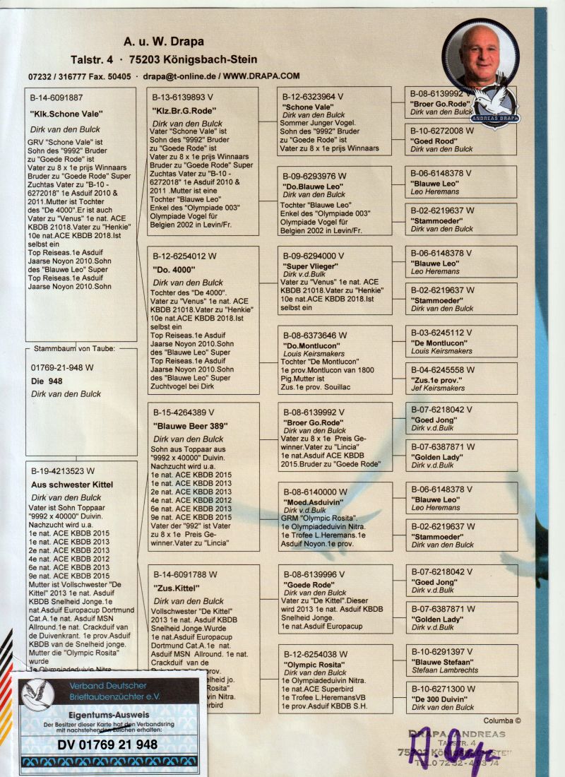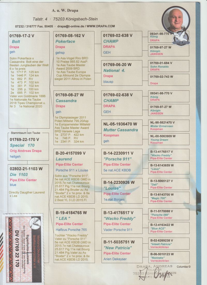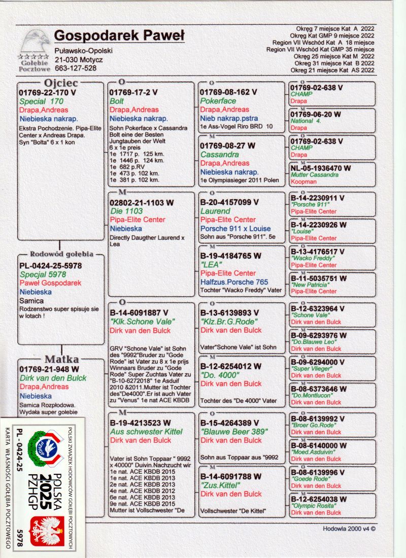 Prezentowane przeze mnie na aukcji gołąbki są zdrowe i w 100% przygotowane do dalszej hodowli. Szczegóły pochodzenia gołębia w rodowodzie. Moje wyniki 2025 na szczeblu oddziału. Gołębie dorosłe: Super Mistrzostwo Oddziału - I Vice Mistrz, 5 z 50- II Vice Mistrz, 5 z całości - II Vice Mistrz, Typowane - II Vice Mistrz, KAT. A - I Vice Mistrz, KAT. B - II Przodownik, KAT. C - I Vice Mistrz, KAT. M -I Vice Mistrz, KAT.D - I Vice Mistrz, KAT. GMP - II Vice Mistrz, KAT. ROCZNE - I Vice Mistrz, KAT. ROCZNE COEFF - I Vice Mistrz. Transport prywatnym kurierem kwota ok 150zł pokrywa kupujący. Istnieje również inna forma dostarczenia gołąbka która będzie ustalana indywidualnie z kupującym. Możliwy również odbiór osobisty lub na wystawie Ogólnopolskiej. Więcej informacji na temat gołębi i transportu pod nr tel. 663-127-528