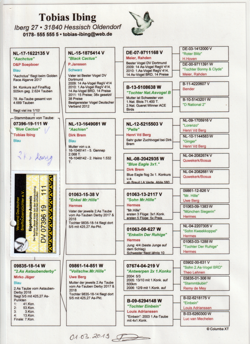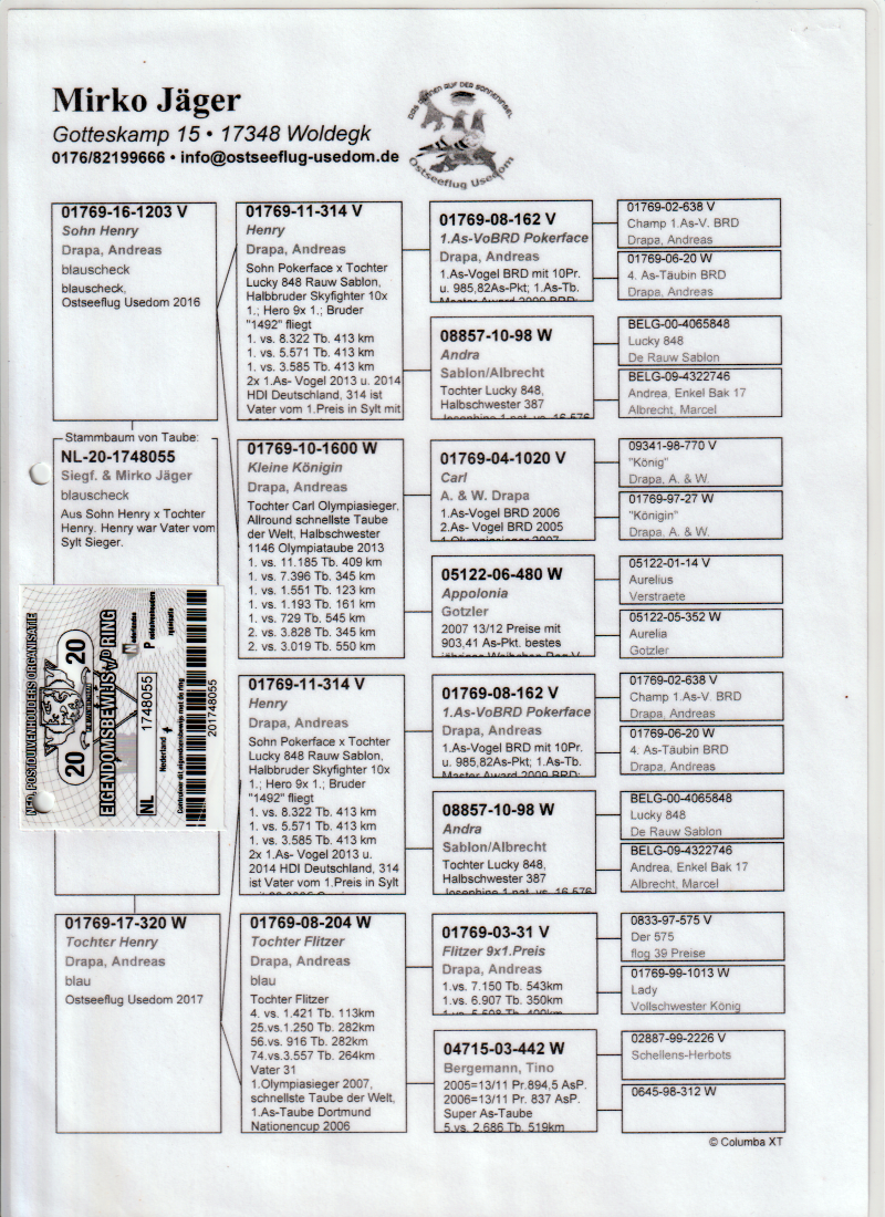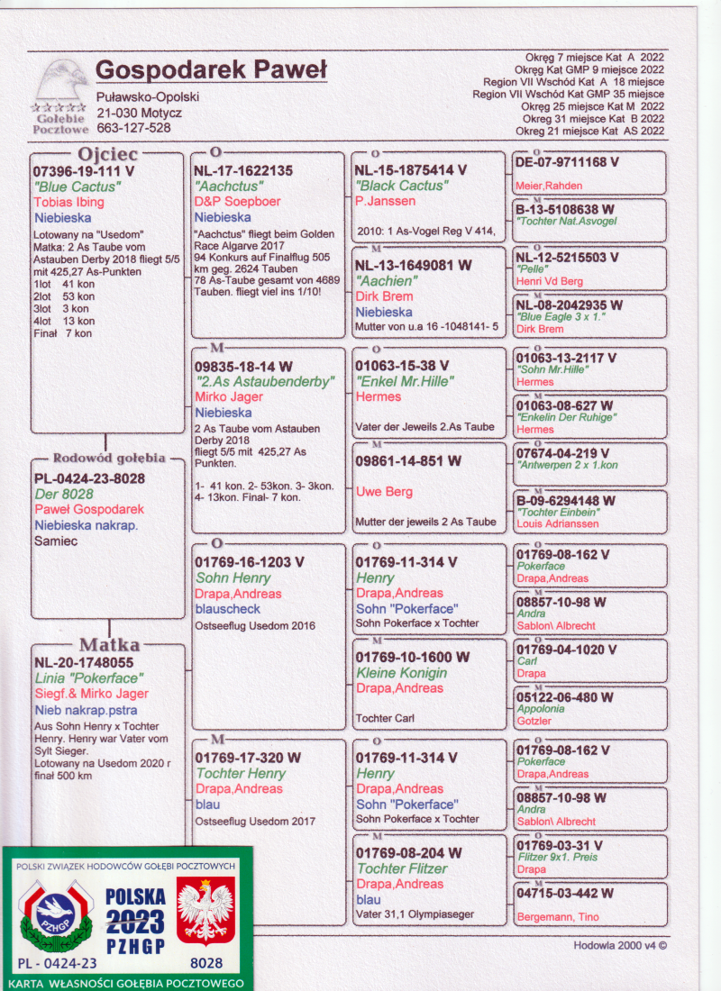 Prezentowane przeze mnie na aukcji gołąbki są zdrowe i w 100% przygotowane do dalszej hodowli. Szczegóły pochodzenia gołębia w rodowodzie. Moje wyniki 2025 na szczeblu oddziału. Gołębie dorosłe: Super Mistrzostwo Oddziału - I Vice Mistrz, 5 z 50- II Vice Mistrz, 5 z całości - II Vice Mistrz, Typowane - II Vice Mistrz, KAT. A - I Vice Mistrz, KAT. B - II Przodownik, KAT. C - I Vice Mistrz, KAT. M -I Vice Mistrz, KAT.D - I Vice Mistrz, KAT. GMP - II Vice Mistrz, KAT. ROCZNE - I Vice Mistrz, KAT. ROCZNE COEFF - I Vice Mistrz. Transport prywatnym kurierem kwota ok 150zł pokrywa kupujący. Istnieje również inna forma dostarczenia gołąbka która będzie ustalana indywidualnie z kupującym. Możliwy również odbiór osobisty lub na wystawie Ogólnopolskiej. Więcej informacji na temat gołębi i transportu pod nr tel. 663-127-528