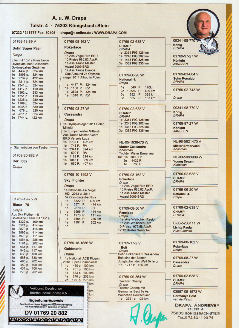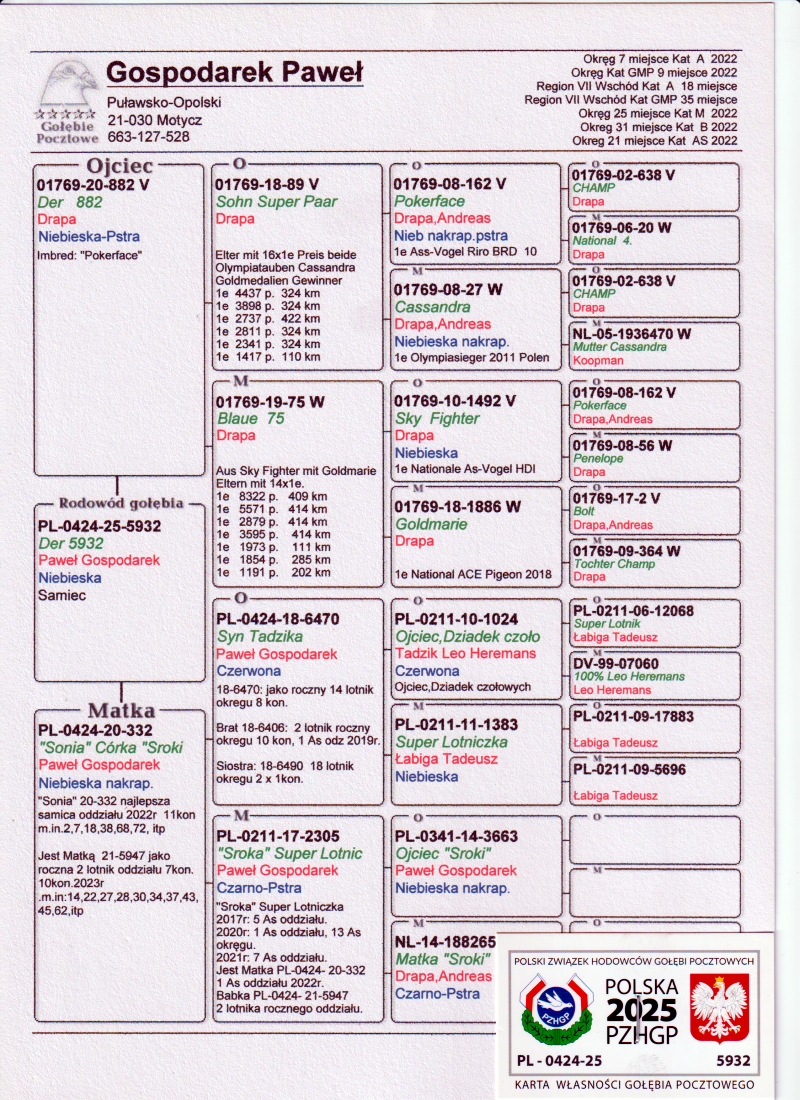 Prezentowane przeze mnie na aukcji gołąbki są zdrowe i w 100% przygotowane do dalszej hodowli. Szczegóły pochodzenia gołębia w rodowodzie. Moje wyniki 2025 na szczeblu oddziału. Gołębie dorosłe: Super Mistrzostwo Oddziału - I Vice Mistrz, 5 z 50- II Vice Mistrz, 5 z całości - II Vice Mistrz, Typowane - II Vice Mistrz, KAT. A - I Vice Mistrz, KAT. B - II Przodownik, KAT. C - I Vice Mistrz, KAT. M -I Vice Mistrz, KAT.D - I Vice Mistrz, KAT. GMP - II Vice Mistrz, KAT. ROCZNE - I Vice Mistrz, KAT. ROCZNE COEFF - I Vice Mistrz. Transport prywatnym kurierem kwota ok 150zł pokrywa kupujący. Istnieje również inna forma dostarczenia gołąbka która będzie ustalana indywidualnie z kupującym. Możliwy również odbiór osobisty lub na wystawie Ogólnopolskiej. Więcej informacji na temat gołębi i transportu pod nr tel. 663-127-528