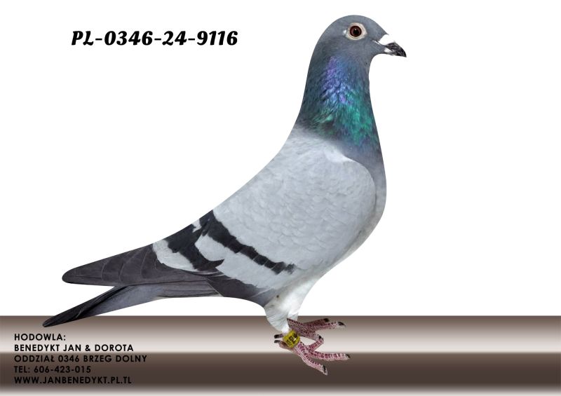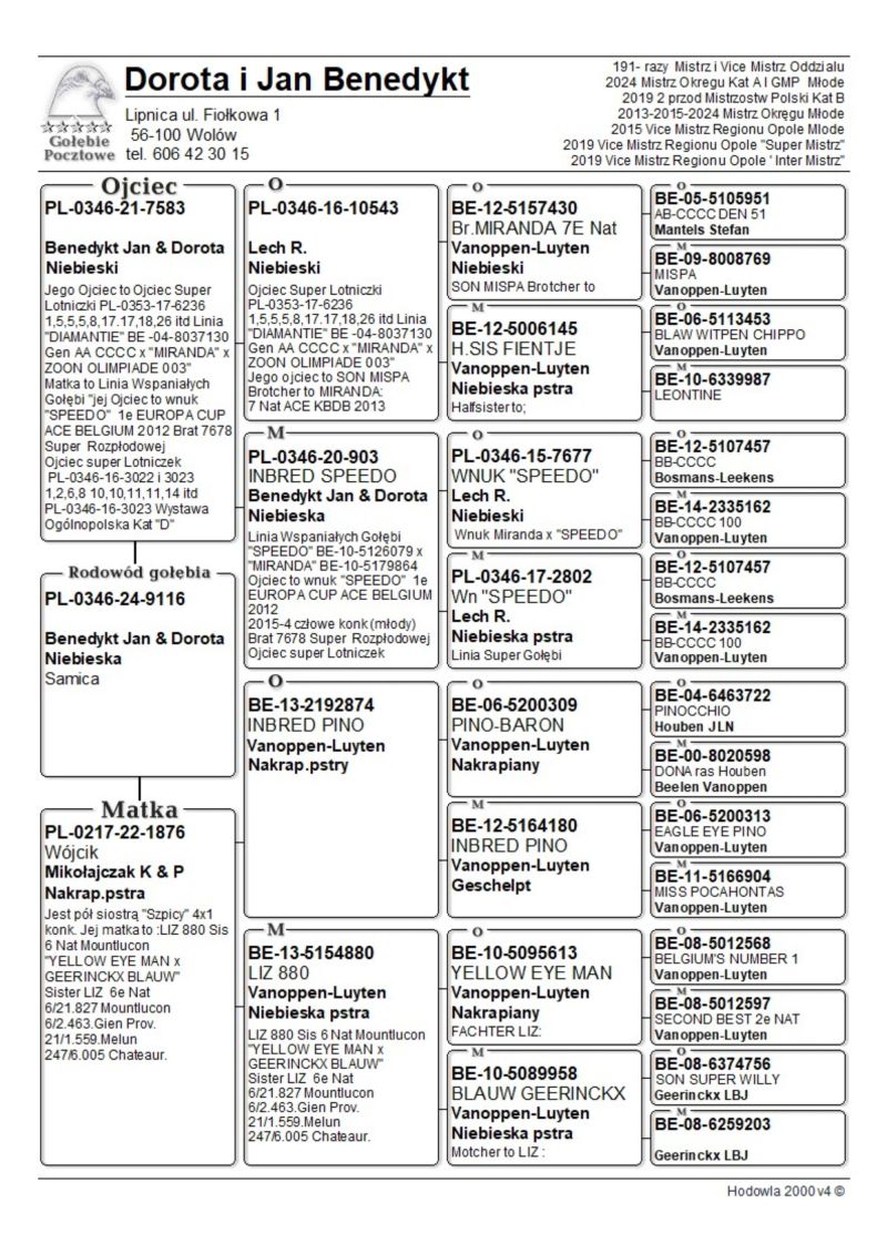PL-0346-24-9116 oryg. Benedykt Jan i Dorota 2024r. Mistrz Okręgu kat A i GMP Młode 3 i 4-Zespół Lotników Polski HGP 2-przod. Mistrzostw Polski Kat.B 191 x Mistrz i Vice Mistrz Oddziału Linia: Speedo-Miranda x Pino Baron