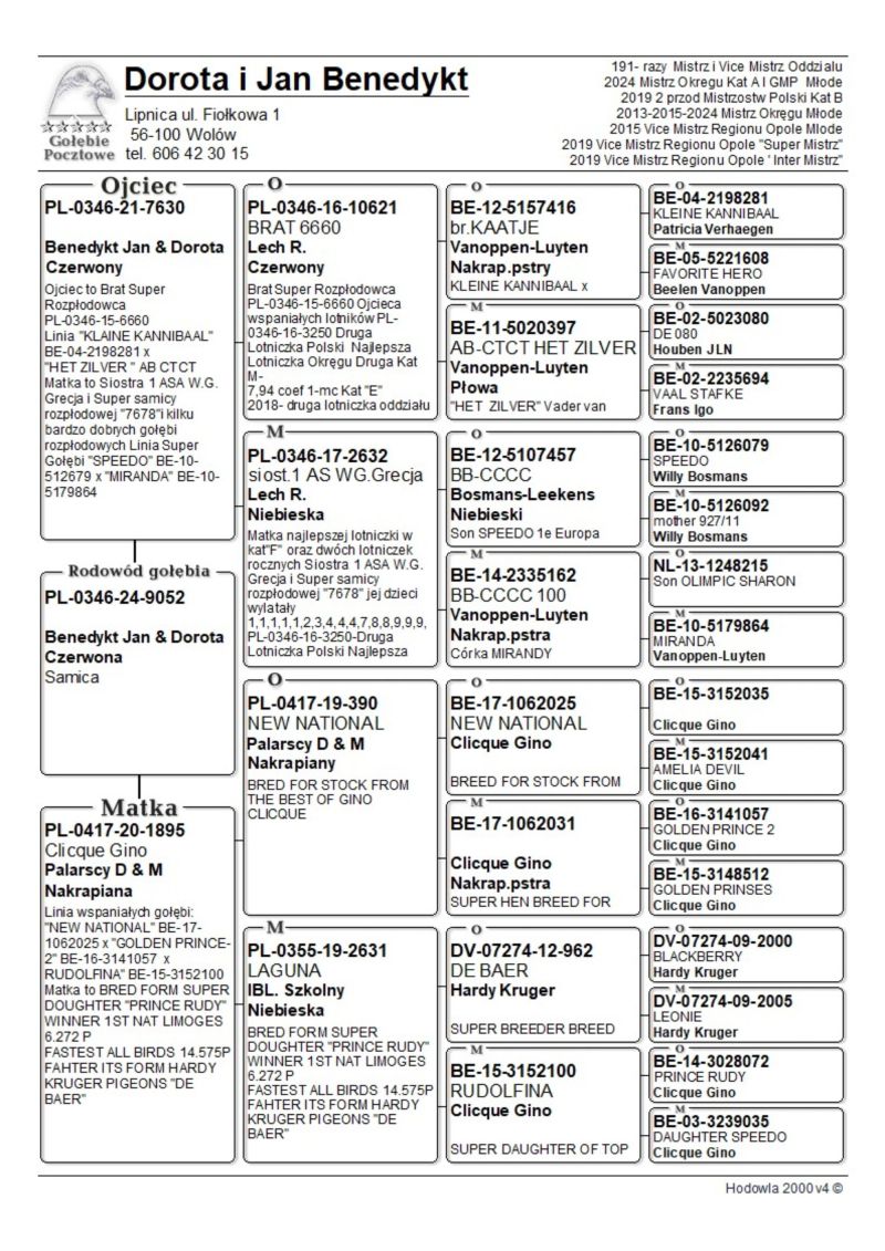 PL-0346-24-9052 oryg. Benedykt Jan i Dorota 2024r. Mistrz Okręgu kat A i GMP Młode 3 i 4-Zespół Lotników Polski HGP 2-przod. Mistrzostw Polski Kat.B 191 x Mistrz i Vice Mistrz Oddziału Linia: Speedo x K.Kannibaal