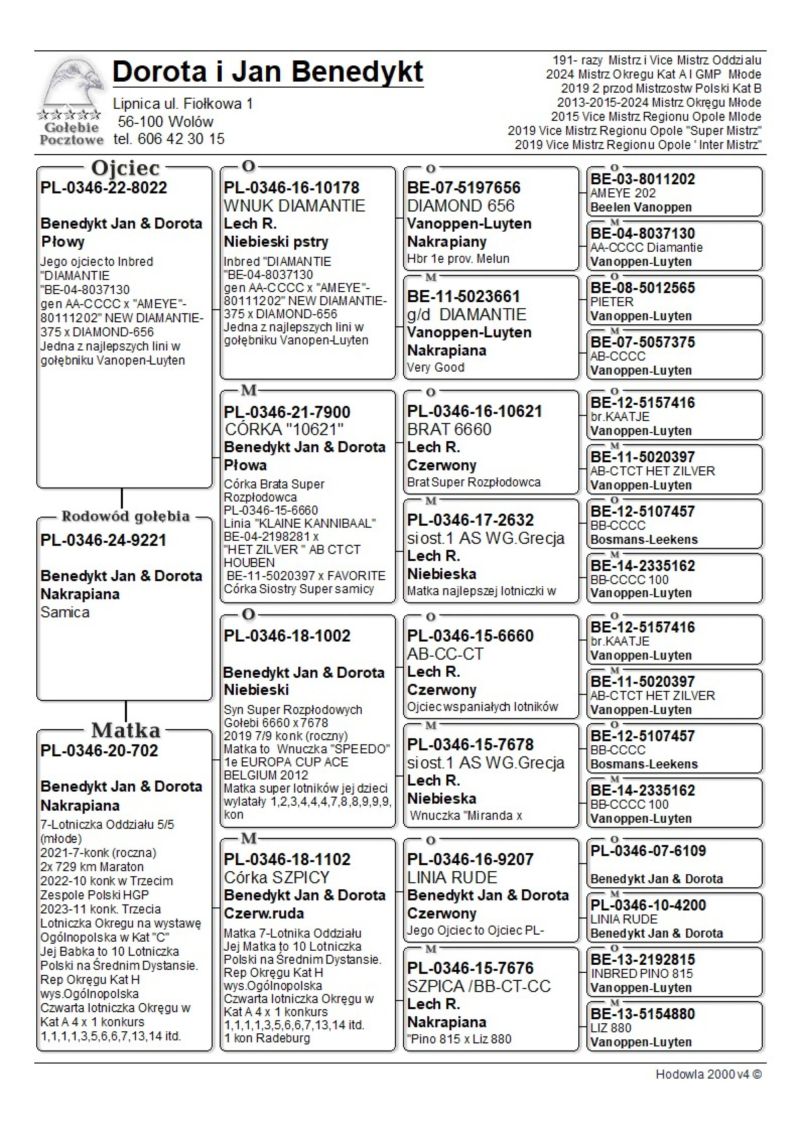 PL-0346-24-9221 oryg. Benedykt Jan i Dorota 2024r. Mistrz Okręgu kat A i GMP Młode 3 i 4-Zespół Lotników Polski HGP 2-przod. Mistrzostw Polski Kat.B 191 x Mistrz i Vice Mistrz Oddziału Linia: Córka lotniczki Okręgu a kat.C wyst. Ogólnopolska