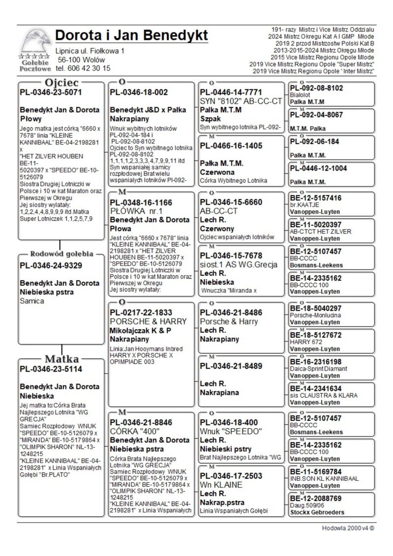 PL-0346-24-9329 oryg. Benedykt Jan i Dorota 2024r. Mistrz Okręgu kat A i GMP Młode 3 i 4-Zespół Lotników Polski HGP 2-przod. Mistrzostw Polski Kat.B 191 x Mistrz i Vice Mistrz Oddziału Linia: Porsche-Hary x Speedo