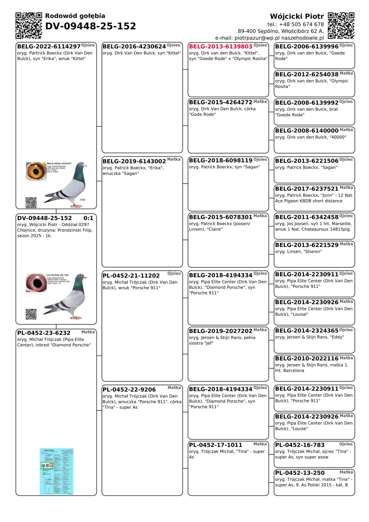 PLGP oryg. Wójcicki Piotr - Oddział 0297 Chojnice, drużyna: Prondzinski Filip, sezon 2025 - 1k. Gołąb był lotowany w sezonie 2025 w Oddziale PZHGP 0297 Chojnice w drużynie Filip Prondzinski w ramach Polskiej Ligii Gołębi Pocztowych. Wyniki za poszczególne loty dostępne są w tabeli wyników. Zapewniamy transport gołębi w cenie: od 1 do 6 szt. - 150 PLN i od 7 do 12 szt. 200 PLN. Gołębia można również odebrać osobiście w Tucholi, Chojnicach lub na Wystawie Ogólnopolskiej w Katowicach. Więcej informacji u kol. Filipa Prondzinskiego pod nr tel.: 606 670 868.