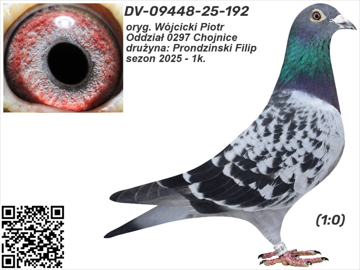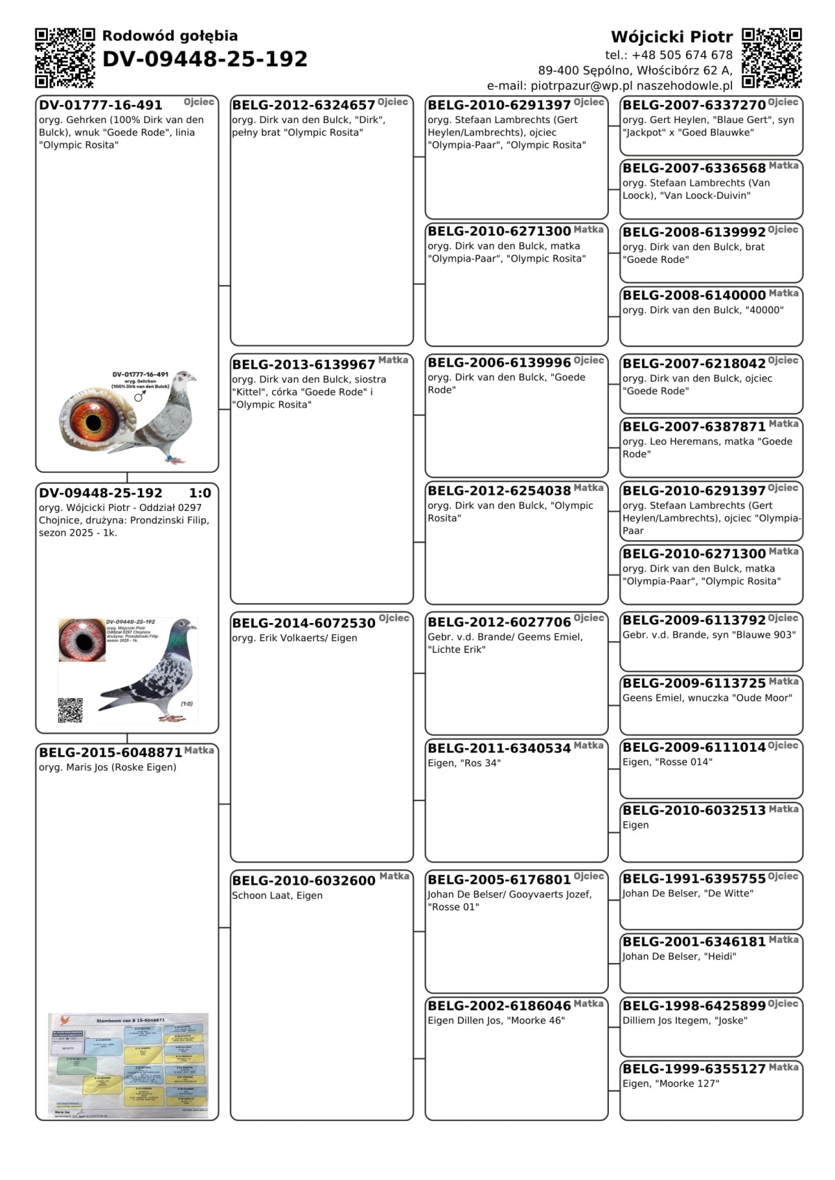 PLGP oryg. Wójcicki Piotr - Oddział 0297 Chojnice, drużyna: Prondzinski Filip, sezon 2025 - 1k. Gołąb był lotowany w sezonie 2025 w Oddziale PZHGP 0297 Chojnice w drużynie Filip Prondzinski w ramach Polskiej Ligii Gołębi Pocztowych. Wyniki za poszczególne loty dostępne są w tabeli wyników. Zapewniamy transport gołębi w cenie: od 1 do 6 szt. - 150 PLN i od 7 do 12 szt. 200 PLN. Gołębia można również odebrać osobiście w Tucholi, Chojnicach lub na Wystawie Ogólnopolskiej w Katowicach. Więcej informacji u kol. Filipa Prondzinskiego pod nr tel.: 606 670 868.