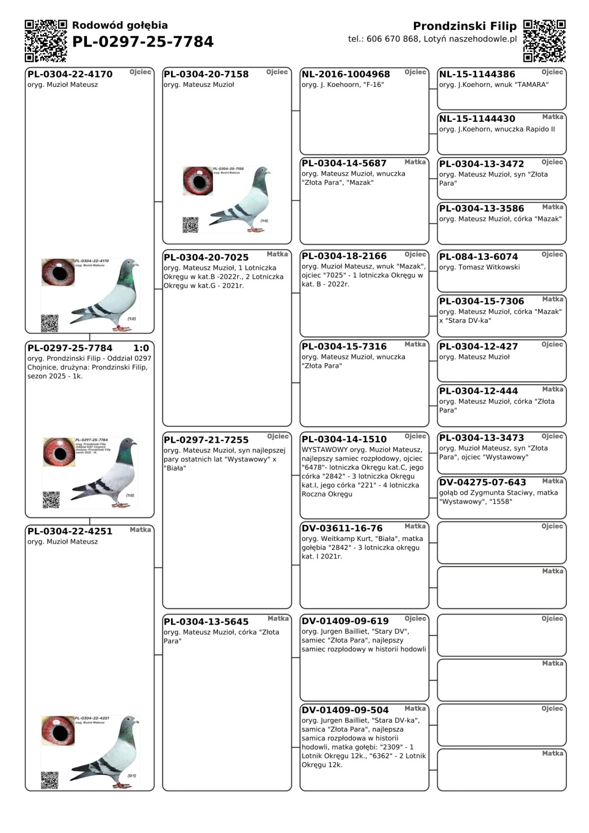 PLGP oryg. Prondzinski Filip - Oddział 0297 Chojnice, drużyna: Prondzinski Filip, sezon 2025 - 1k. Gołąb był lotowany w sezonie 2025 w Oddziale PZHGP 0297 Chojnice w drużynie Filip Prondzinski w ramach Polskiej Ligii Gołębi Pocztowych. Wyniki za poszczególne loty dostępne są w tabeli wyników. Zapewniamy transport gołębi w cenie: od 1 do 6 szt. - 150 PLN i od 7 do 12 szt. 200 PLN. Gołębia można również odebrać osobiście w Tucholi, Chojnicach lub na Wystawie Ogólnopolskiej w Katowicach. Więcej informacji u kol. Filipa Prondzinskiego pod nr tel.: 606 670 868.