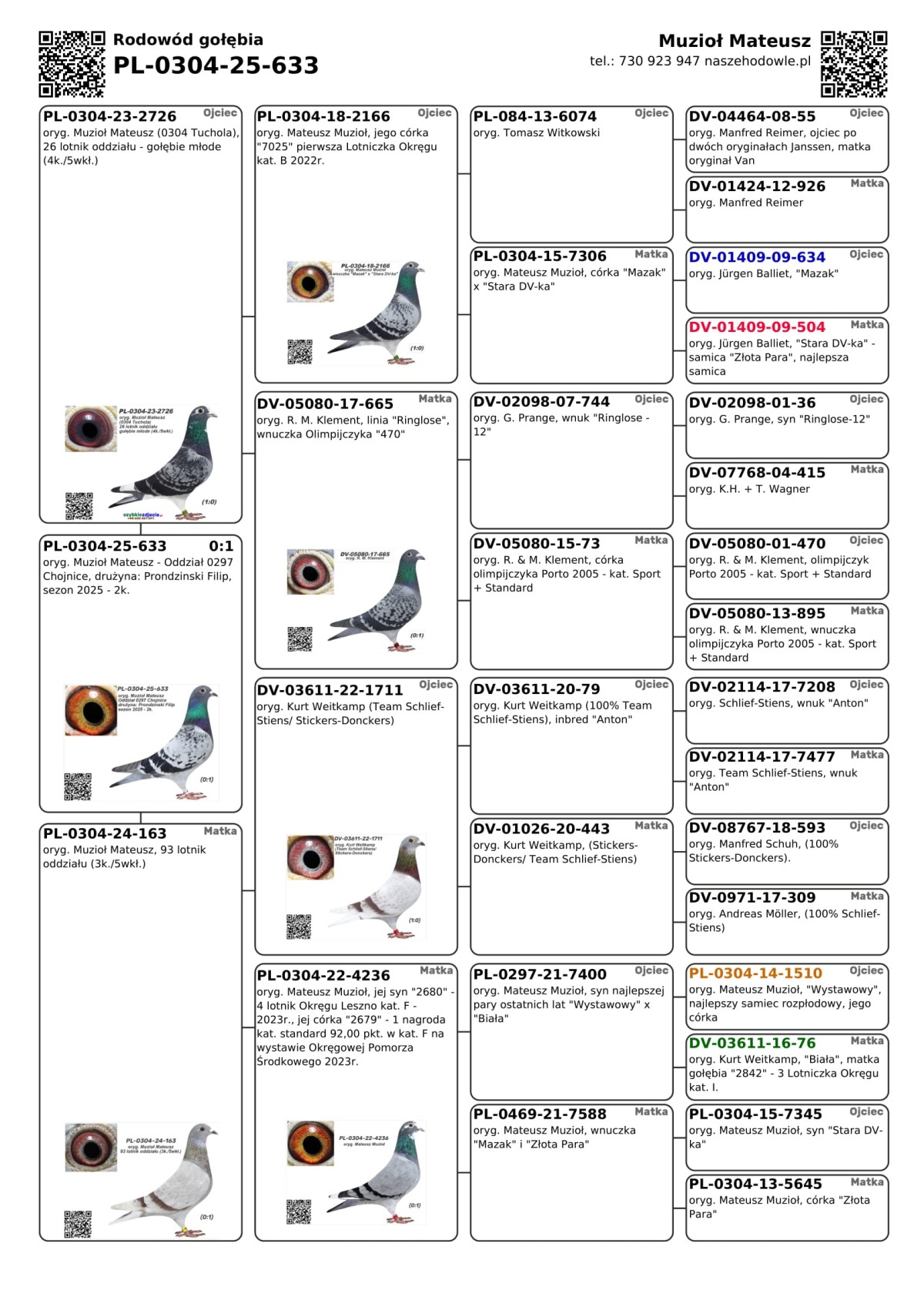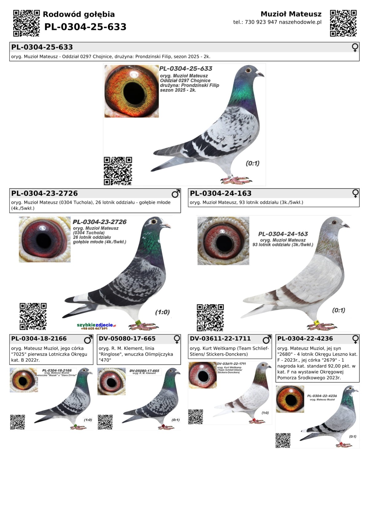 PLGP oryg. Muzioł Mateusz - Oddział 0297 Chojnice, drużyna: Prondzinski Filip, sezon 2025 - 2k. Gołąb był lotowany w sezonie 2025 w Oddziale PZHGP 0297 Chojnice w drużynie Filip Prondzinski w ramach Polskiej Ligii Gołębi Pocztowych. Wyniki za poszczególne loty dostępne są w tabeli wyników. Zapewniamy transport gołębi w cenie: od 1 do 6 szt. - 150 PLN i od 7 do 12 szt. 200 PLN. Gołębia można również odebrać osobiście w Tucholi, Chojnicach lub na Wystawie Ogólnopolskiej w Katowicach. Więcej informacji u kol. Filipa Prondzinskiego pod nr tel.: 606 670 868.