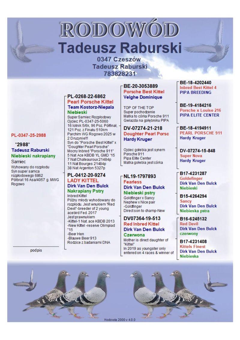 Hodowla skupiona w lotach gołębi na wspólnych gołębnikach z wieloma sukcesami. Zaprasza Państwa do licytacji wartościowego materiału do dalszej hodowli. Proponowany gołąb to linia Hardy Kruger I Kittel, pólbrat do 16 As/4058g. MWG Rogowo. Linia moich bazowych par rozpłodowych, wielu kuzynów osiąga sukcesy na wspólnych gołębnikach, i nie tylko. Więcej informacji w rodowodzie oraz pod nr. tel. UWAGA WYSYŁKA PRYWATNYM KURIEREM LUB ODBIÓR OSOBISTY, LUB ODBIÓR NA WYSTAWIE OGÓLNOPOLSKIEJ