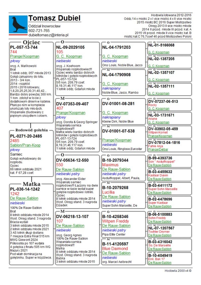 Gołąb po wszystkich kuracjach gotowy do łączenia w pary. ****************************************** Moje stado opiera się na ptakach które w latach 2012-2016 pozwoliły mi wygrywać w oddziale i okręgu w różnych kategoriach, lecąc w 2 różnych oddziałach 036 i 0394. Najważniejsze osiągnięcia to Mistrz okręgu kat. C 49 miejsce w Polsce, II vice Mistrz okręgu kat. B i młode, Super Mistrz Oddziału. Wszystkie wyniki dokładnie opisane na końcu aukcji. Do lotowania wróciłem „na chwilę” w 2021 r. na nowym miejscu zamieszkania w bardzo ciężkim sezonie 3 x vice Mistrz Oddziału gołębi młodych. 2,5,11,16,19,22,23,27,28,40 pozycje w klasyfikacji lotników. 3 x Mistrz sekcji oraz XIII przodownika okręgu Bydgoszcz. Zacząłem też lotowanie na WG wysyłając po kilka sztuk na sezon. 2021 – konkursy na finałach na WG Krakus i Super Gołąb, 2022 - 14 miejsce Extra Finał 518 km WG Super Gołąb, 2023 – 11 miejsce Finał 502 km WG Bojano. 2024 - 4 miejsce Półfinał WG Tatry, WG Bojano 4 miejsce lot konkursowy, 34 miejsce Półfinał, 17 miejsce Drużyna, 54, 78, 79, 81 lotnik. Po moich gołębiach w 2024 ptaki wylatały: po pełnej parze 68 miejsce Finał Super Gołąb, po samcu 8 miejsce Extra Finał WG Warmia, po samicy 16 miejsce Finał WG Roztocze, po samcu 3 AS długi dystans i 7 miejsce Extra Finał MWG Giewont. 2025 31 lotnik Derby Carmelo Yupi, 43 miejsce Extra Finał WG Tatry, 12 miejsce Finał WG Carpatia, 40 miejsce Finał WG Krakus (56 seria na 849 hodowców 2/2 w konkursie z 3 wysłanych ptaków), po samicy ode mnie 24 miejsce Finał Corabia One Loft Race. ********************** Wszystkie gołębie przyjęły komplet szczepień(Pharmavac, salmovir + ospa). Więcej informacji w rodowodach, zapraszam też do kontaktu telefonicznego, mailowego bądź WhatsApp. ********************* TRANSPORT Istnieje możliwość wysyłki kurierskiej w cenie ok. 150 zł Zapraszam również do odbioru osobistego.