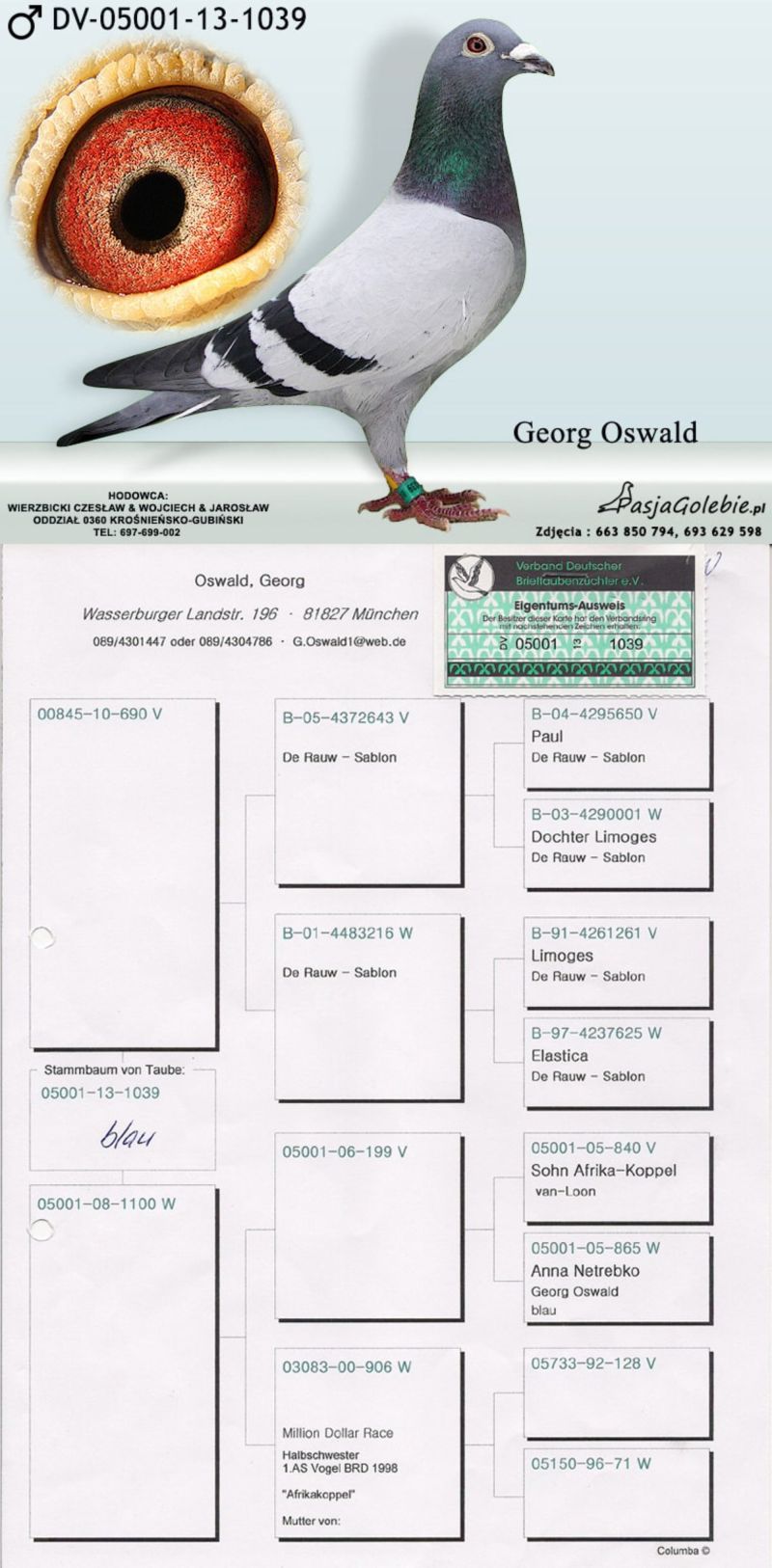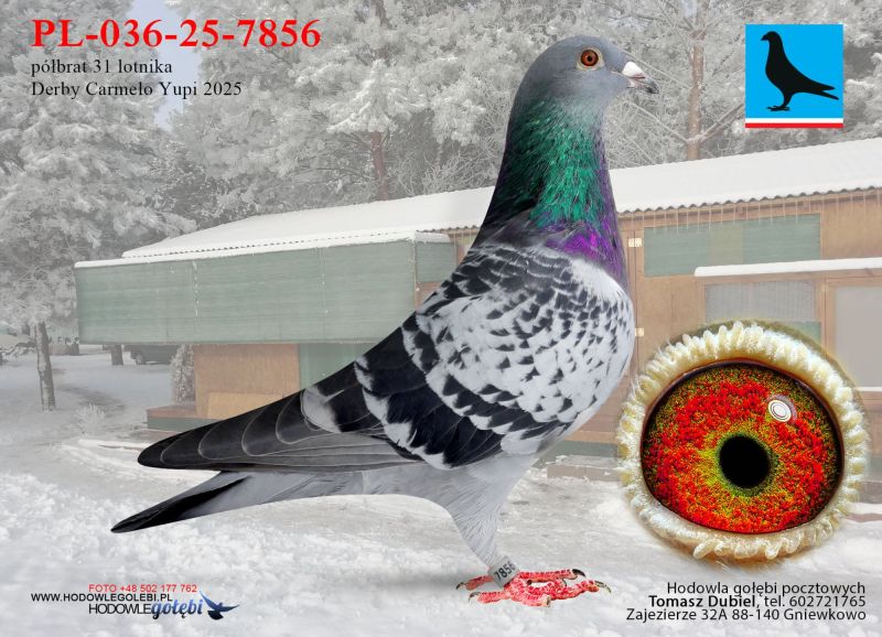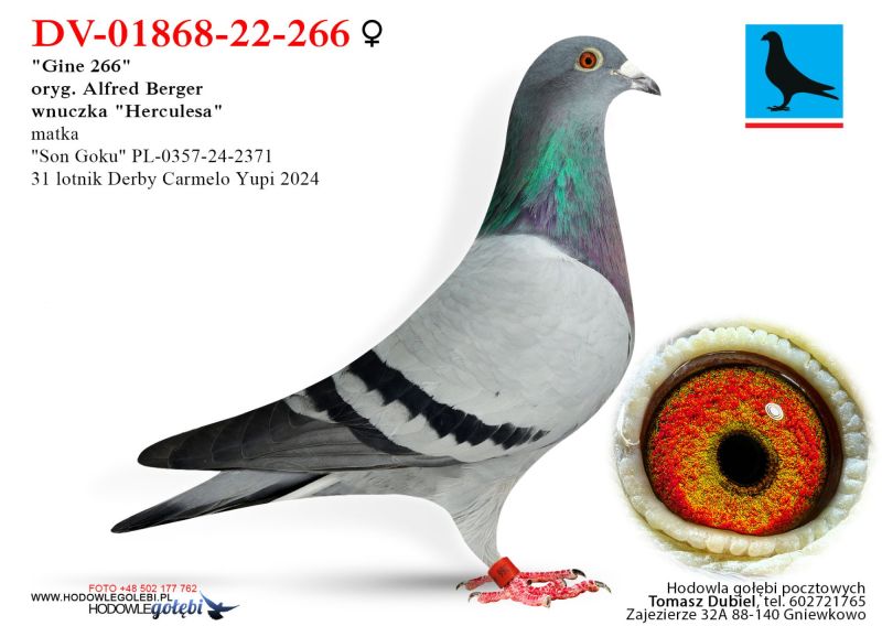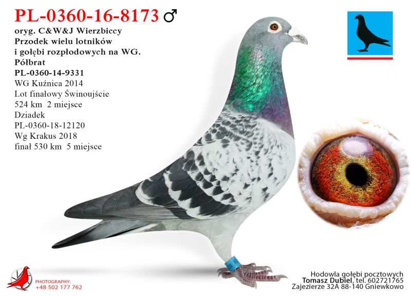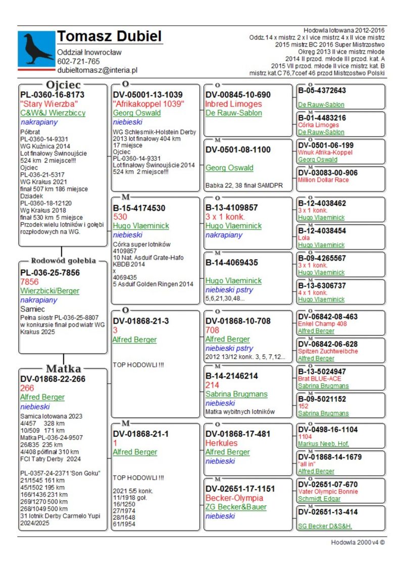 Gołąb po wszystkich kuracjach gotowy do łączenia w pary. Pełna siostra w tym roku konkurs na finale na Krakusie pod wiatr. Mocny samczyk po mojej najlepszej samicy od kiedy przeszedłem na wspólne gołębniki. Każdy wysłany po niej gołąb dał mi satysfakcję. Konkursy na finałach różnych gołębników, w różnych warunkach. Ojciec to przepięknysamiec po którym na krakusie mam juz konkursy w różnych latach, z różnymi samicami. Polecam. ****************************************** Moje stado opiera się na ptakach które w latach 2012-2016 pozwoliły mi wygrywać w oddziale i okręgu w różnych kategoriach, lecąc w 2 różnych oddziałach 036 i 0394. Najważniejsze osiągnięcia to Mistrz okręgu kat. C 49 miejsce w Polsce, II vice Mistrz okręgu kat. B i młode, Super Mistrz Oddziału. Wszystkie wyniki dokładnie opisane na końcu aukcji. Do lotowania wróciłem „na chwilę” w 2021 r. na nowym miejscu zamieszkania w bardzo ciężkim sezonie 3 x vice Mistrz Oddziału gołębi młodych. 2,5,11,16,19,22,23,27,28,40 pozycje w klasyfikacji lotników. 3 x Mistrz sekcji oraz XIII przodownika okręgu Bydgoszcz. Zacząłem też lotowanie na WG wysyłając po kilka sztuk na sezon. 2021 – konkursy na finałach na WG Krakus i Super Gołąb, 2022 - 14 miejsce Extra Finał 518 km WG Super Gołąb, 2023 – 11 miejsce Finał 502 km WG Bojano. 2024 - 4 miejsce Półfinał WG Tatry, WG Bojano 4 miejsce lot konkursowy, 34 miejsce Półfinał, 17 miejsce Drużyna, 54, 78, 79, 81 lotnik. Po moich gołębiach w 2024 ptaki wylatały: po pełnej parze 68 miejsce Finał Super Gołąb, po samcu 8 miejsce Extra Finał WG Warmia, po samicy 16 miejsce Finał WG Roztocze, po samcu 3 AS długi dystans i 7 miejsce Extra Finał MWG Giewont. 2025 31 lotnik Derby Carmelo Yupi, 43 miejsce Extra Finał WG Tatry, 12 miejsce Finał WG Carpatia, 40 miejsce Finał WG Krakus (56 seria na 849 hodowców 2/2 w konkursie z 3 wysłanych ptaków), po samicy ode mnie 24 miejsce Finał Corabia One Loft Race. ********************** Wszystkie gołębie przyjęły komplet szczepień(Pharmavac, salmovir + ospa). Więcej informacji w rodowodach, zapraszam też do kontaktu telefonicznego, mailowego bądź WhatsApp. ********************* TRANSPORT Istnieje możliwość wysyłki kurierskiej w cenie ok. 150 zł Zapraszam również do odbioru osobistego.