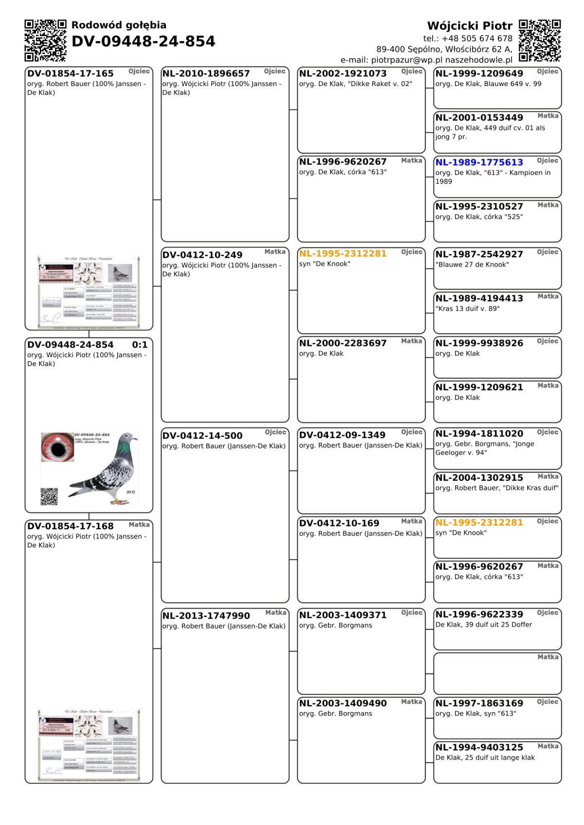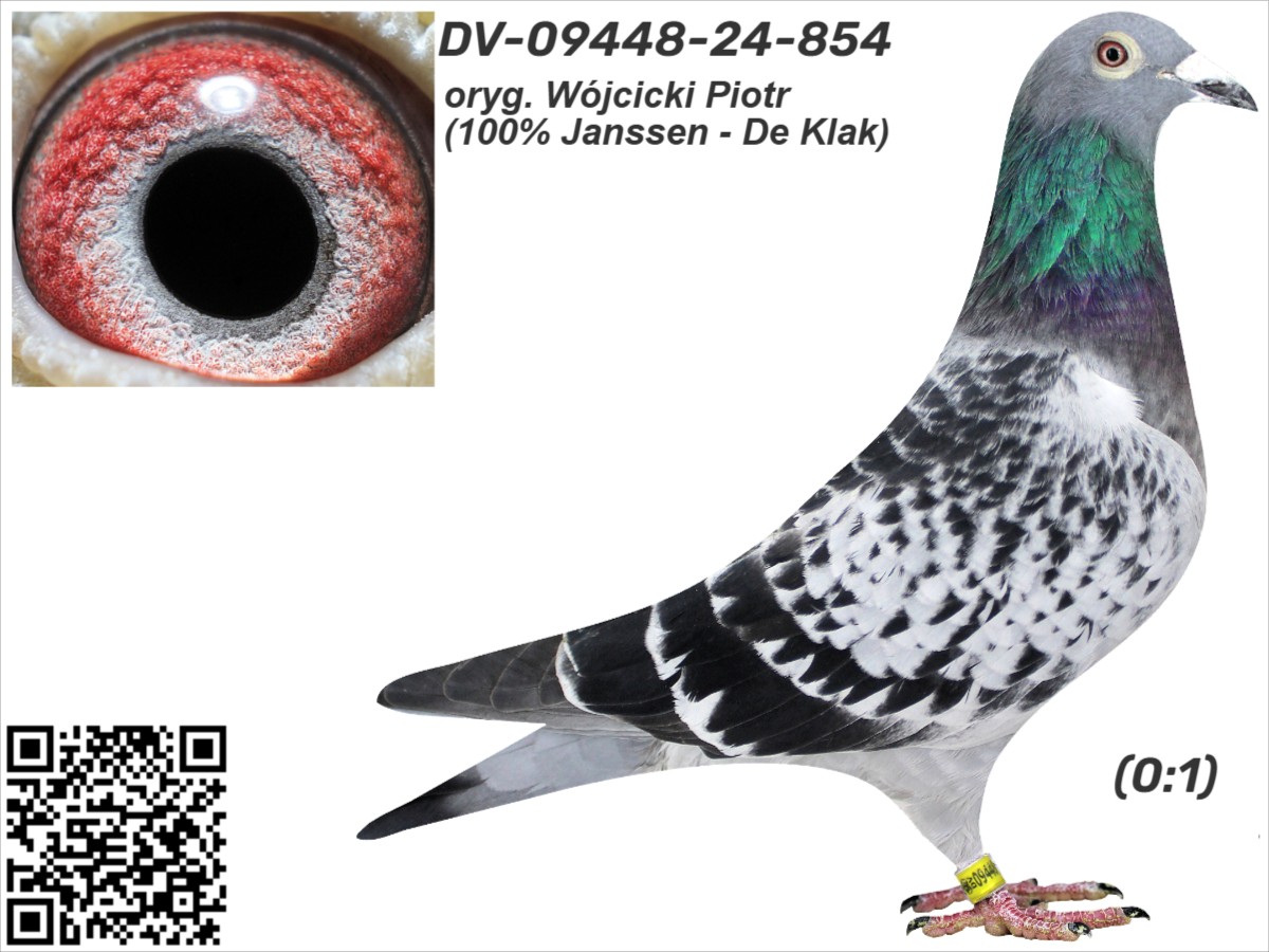 oryg. Wójcicki Piotr (100% Janssen - De Klak) Szczegóły pochodzenia w rodowodzie i załączonych materiałach. Więcej informacji o gołębiach i transporcie pod nr tel.: +48 505 674 678.