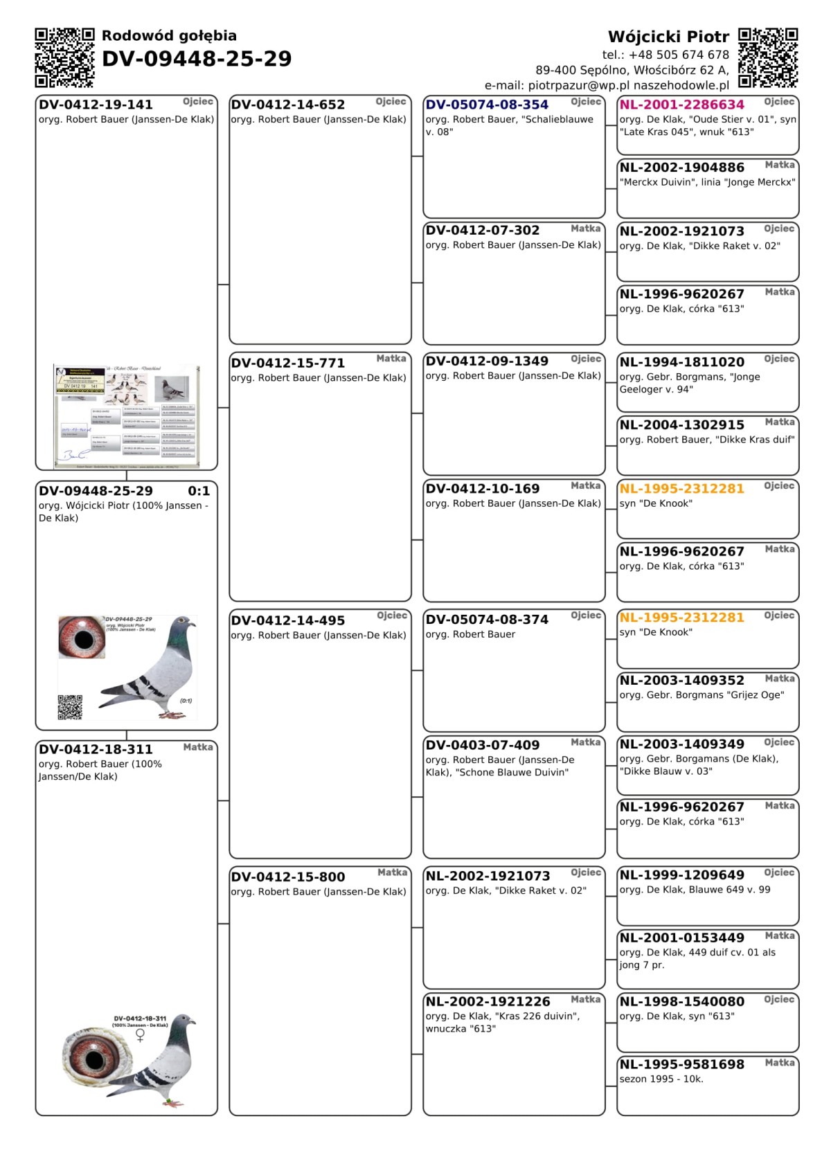 oryg. Wójcicki Piotr (100% Janssen - De Klak) Szczegóły pochodzenia w rodowodzie i załączonych materiałach. Więcej informacji o gołębiach i transporcie pod nr tel.: +48 505 674 678.