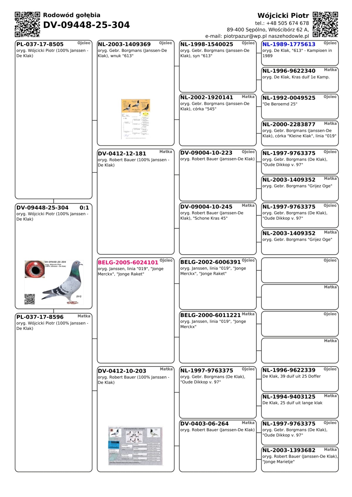 oryg. Wójcicki Piotr (100% Janssen - De Klak) Szczegóły pochodzenia w rodowodzie i załączonych materiałach. Więcej informacji o gołębiach i transporcie pod nr tel.: +48 505 674 678.