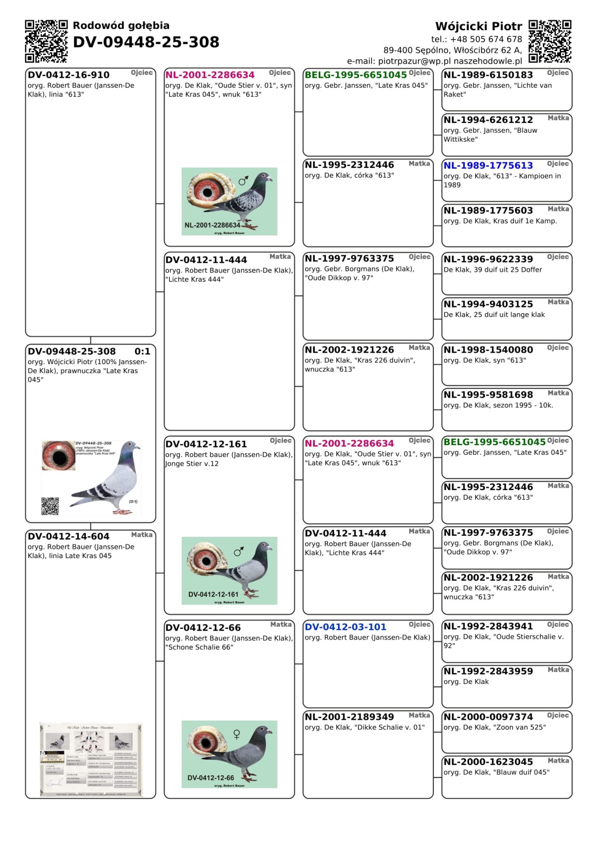 oryg. Wójcicki Piotr (100% Janssen-De Klak), prawnuczka "Late Kras 045" Szczegóły pochodzenia w rodowodzie i załączonych materiałach. Więcej informacji o gołębiach i transporcie pod nr tel.: +48 505 674 678.