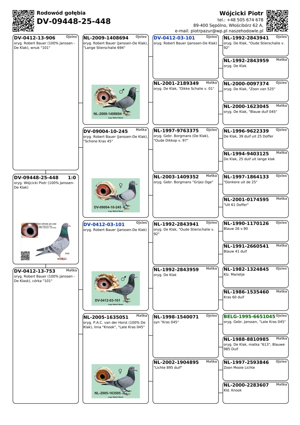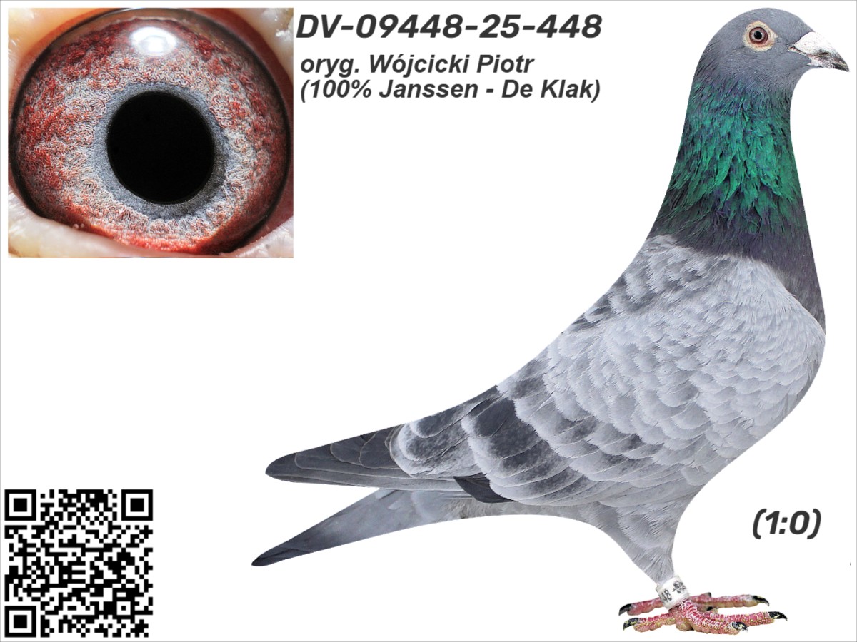 oryg. Wójcicki Piotr (100% Janssen - De Klak) Szczegóły pochodzenia w rodowodzie i załączonych materiałach. Więcej informacji o gołębiach i transporcie pod nr tel.: +48 505 674 678.