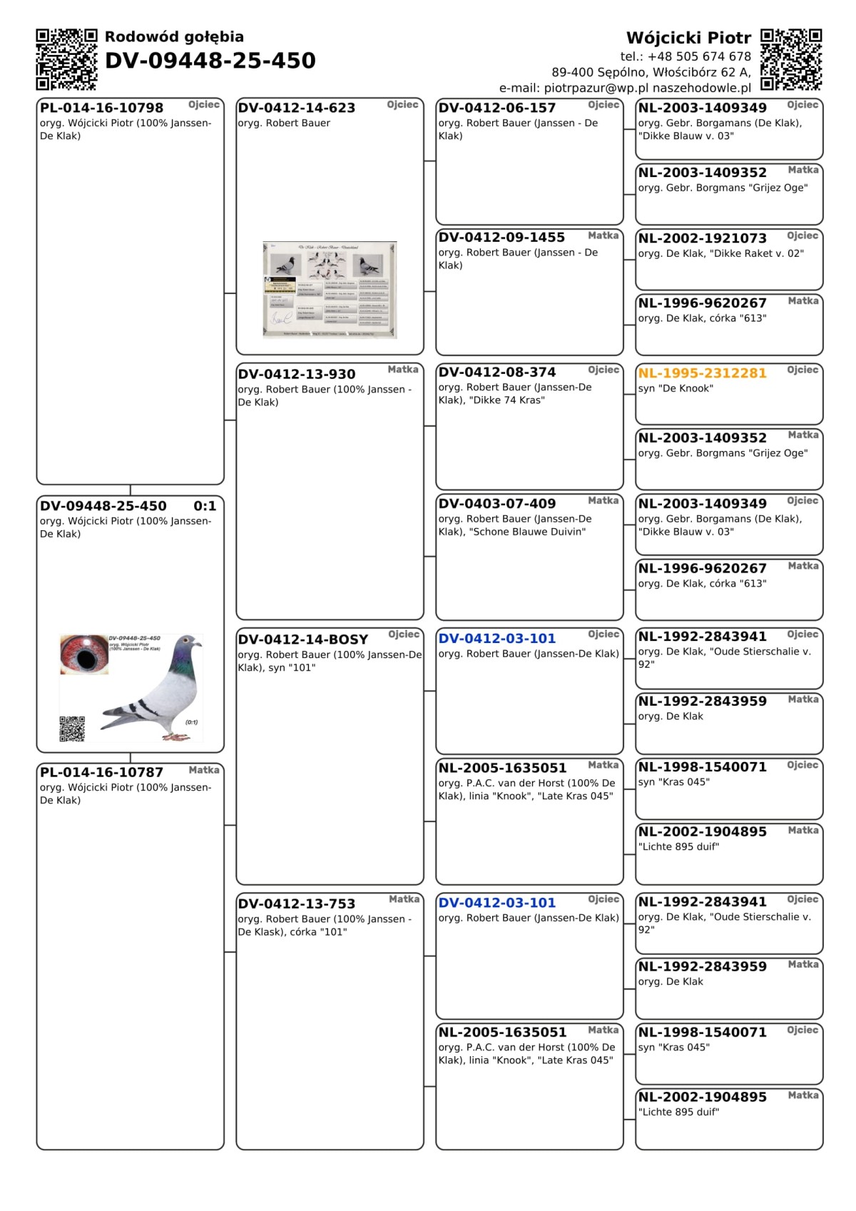 oryg. Wójcicki Piotr (100% Janssen-De Klak) Szczegóły pochodzenia w rodowodzie i załączonych materiałach. Więcej informacji o gołębiach i transporcie pod nr tel.: +48 505 674 678.