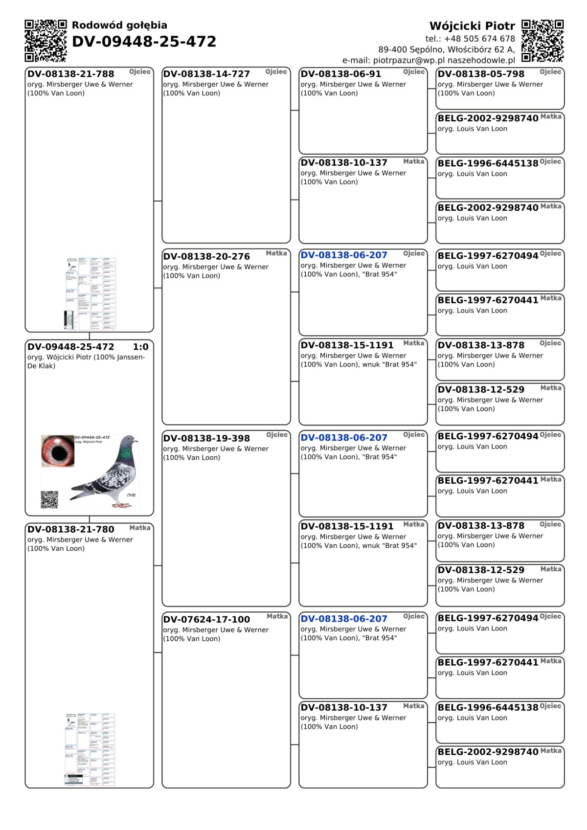 oryg. Wójcicki Piotr (100% Janssen - De Klak) Szczegóły pochodzenia w rodowodzie i załączonych materiałach. Więcej informacji o gołębiach i transporcie pod nr tel.: +48 505 674 678.