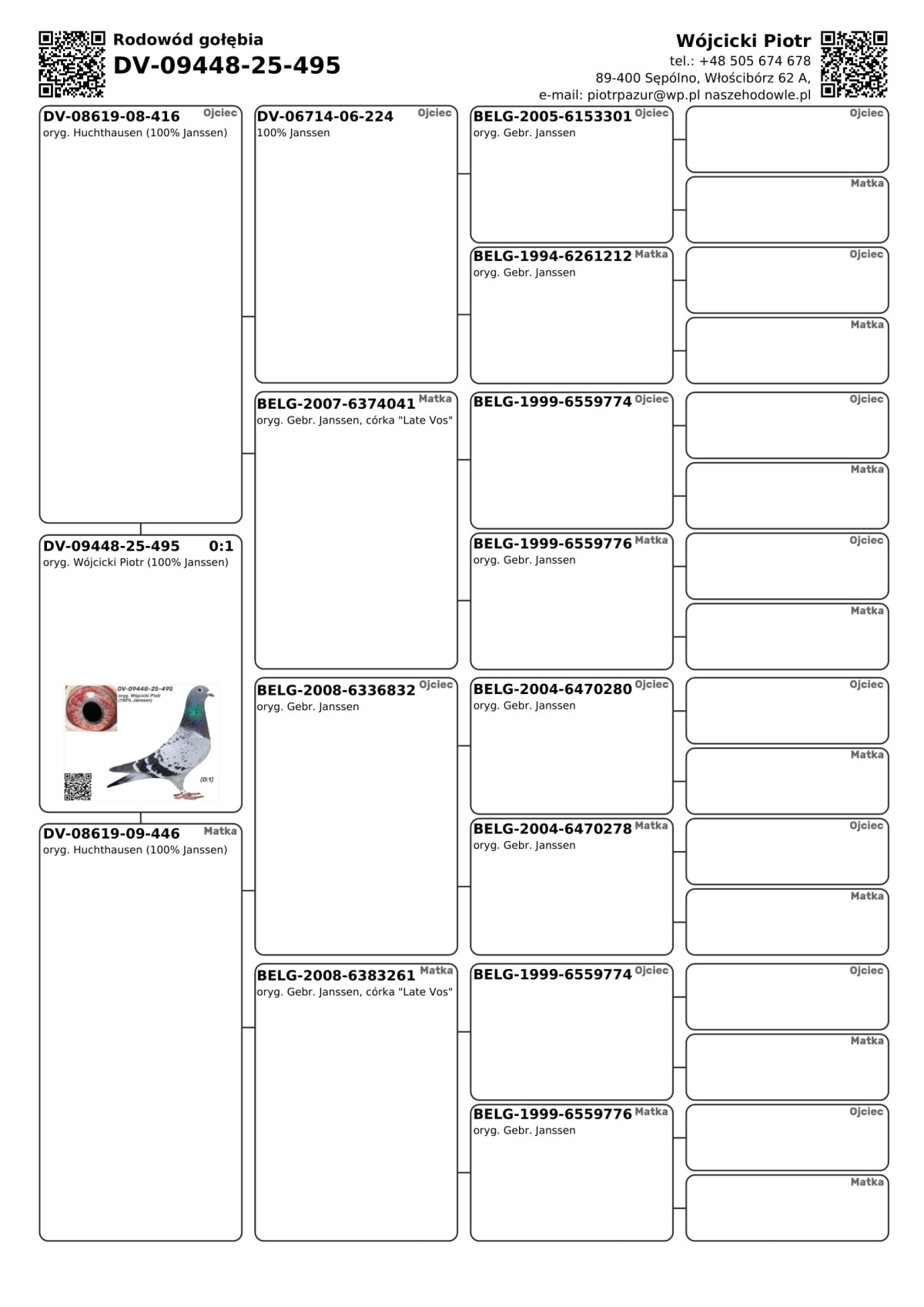 oryg. Wójcicki Piotr (100% Janssen) Szczegóły pochodzenia w rodowodzie i załączonych materiałach. Więcej informacji o gołębiach i transporcie pod nr tel.: +48 505 674 678.