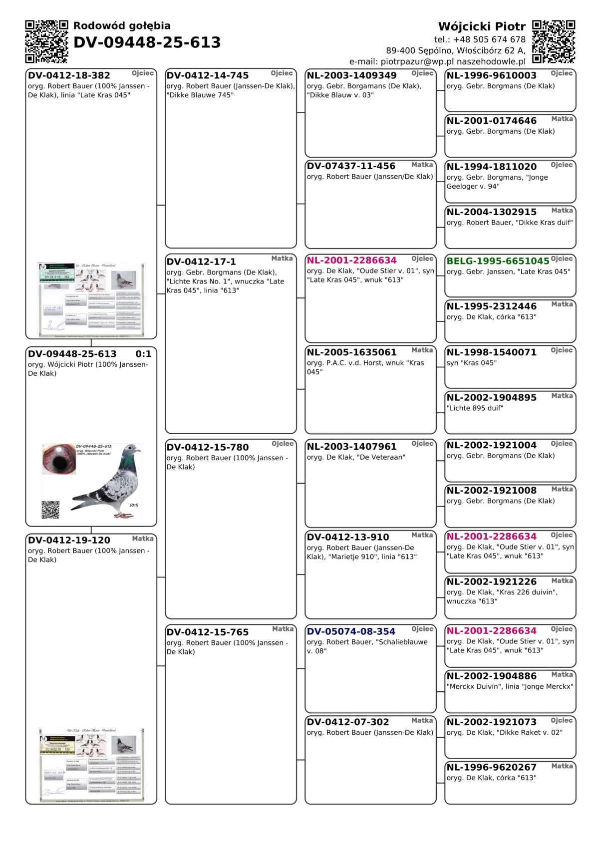 oryg. Wójcicki Piotr (100% Janssen - De Klak) Szczegóły pochodzenia w rodowodzie i załączonych materiałach. Więcej informacji o gołębiach i transporcie pod nr tel.: +48 505 674 678.
