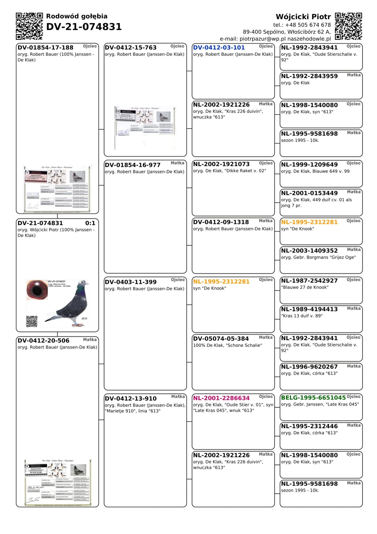 oryg. Wójcicki Piotr (100% Janssen - De Klak) Szczegóły pochodzenia w rodowodzie i załączonych materiałach. Więcej informacji o gołębiach i transporcie pod nr tel.: +48 505 674 678.