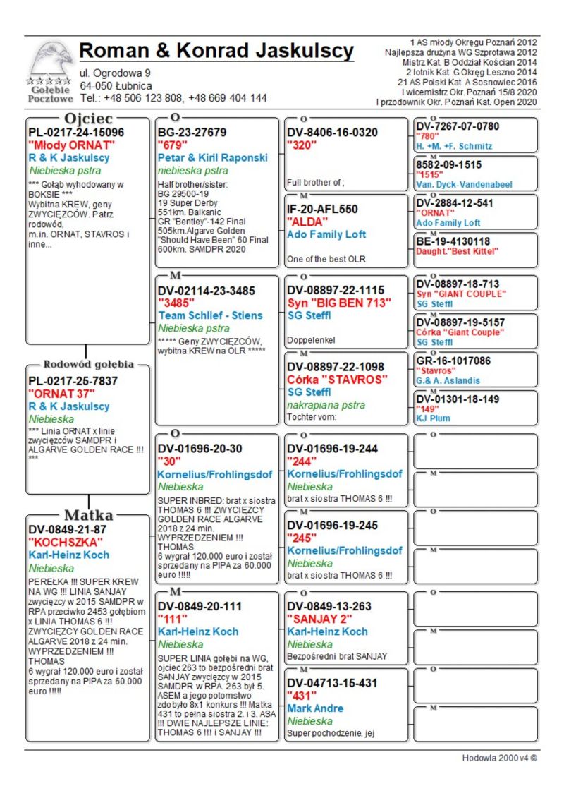 Oryginalny gołąb z hodowli Romana & Konrada Jaskulskich. Szczegóły pochodzenia w rodowodzie. Gołąb gotowy do sezonu lęgowego, zaszczepiony Columba PHA i Columba RP oraz przeciwko salmonellozie (Salmo PT). Więcej informacji pod nr tel.: 506 123 808. Wpłata za gołębia na konto po zakończeniu aukcji. Możliwy odbiór osobisty lub dostawa realizowana przez kuriera w cenie 160 zł. Możliwy także odbiór na wystawie Ogólnopolskiej w Katowicach (sobota lub niedziela).