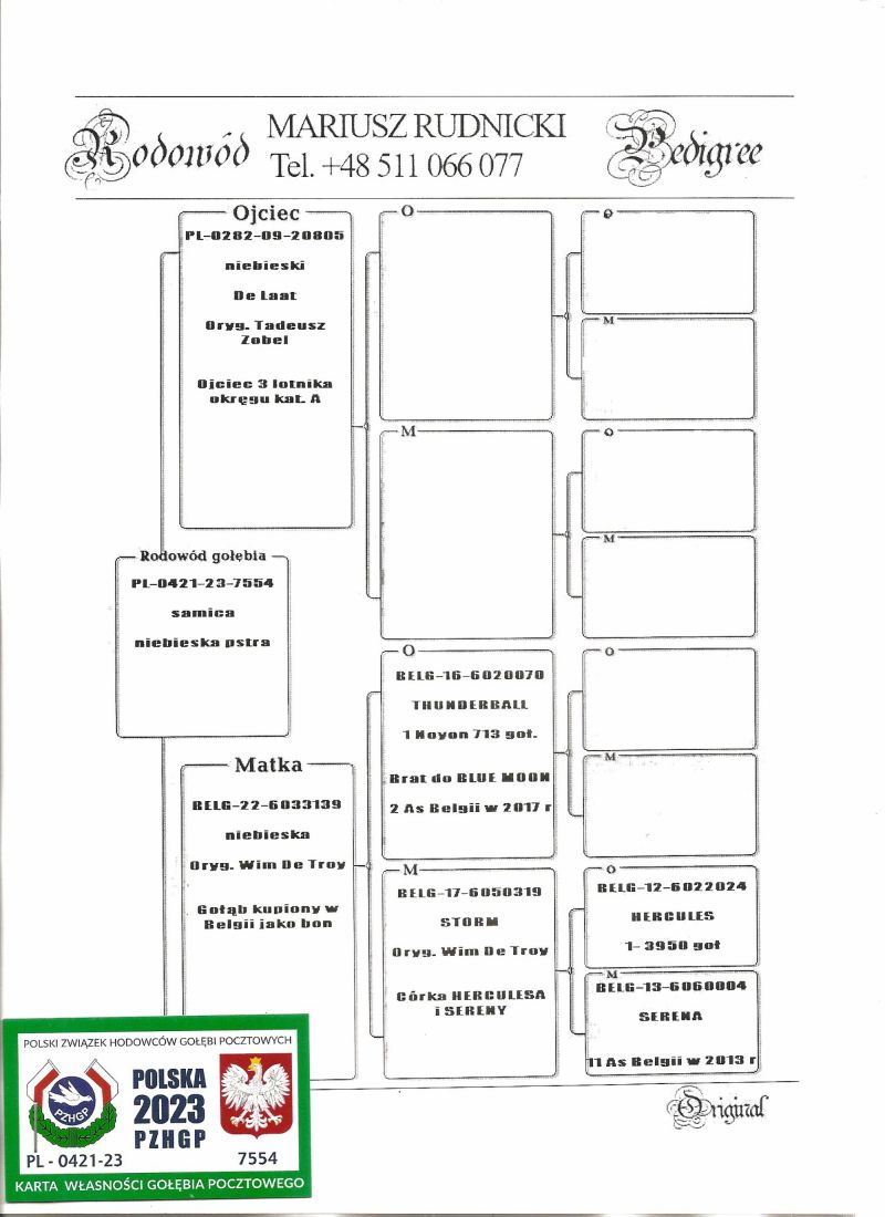 Matka oryg. Wim De Troy. Zwycięzca wielu lotów narodowych w Belgii. Linia Sereny i Herkulesa. Szczegóły pochodzenia w rodowodzie i pod nr tel. 696 241 555