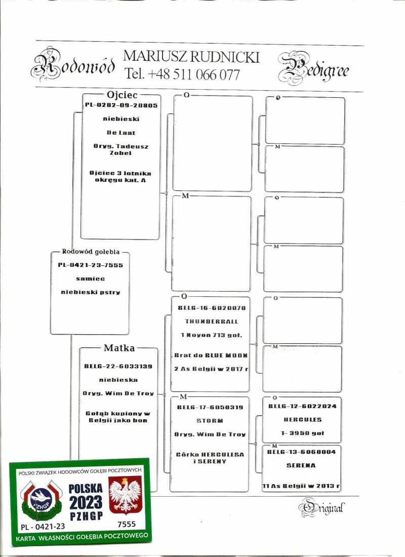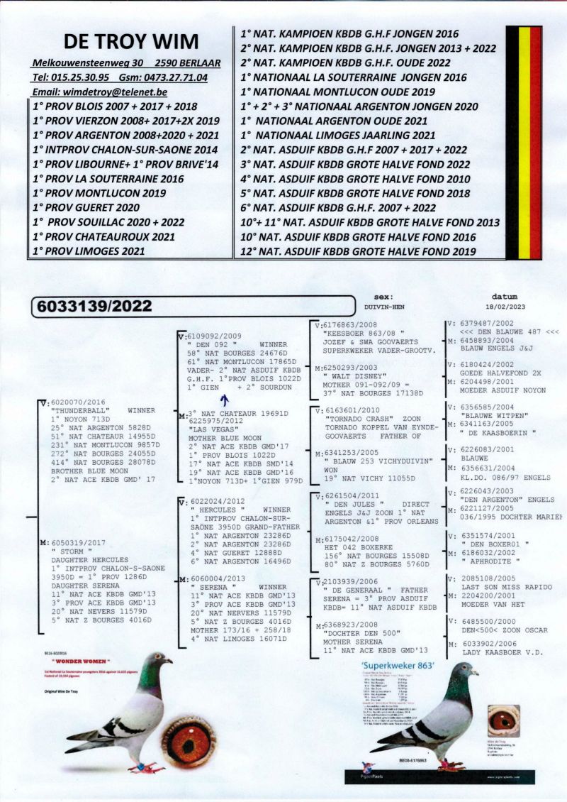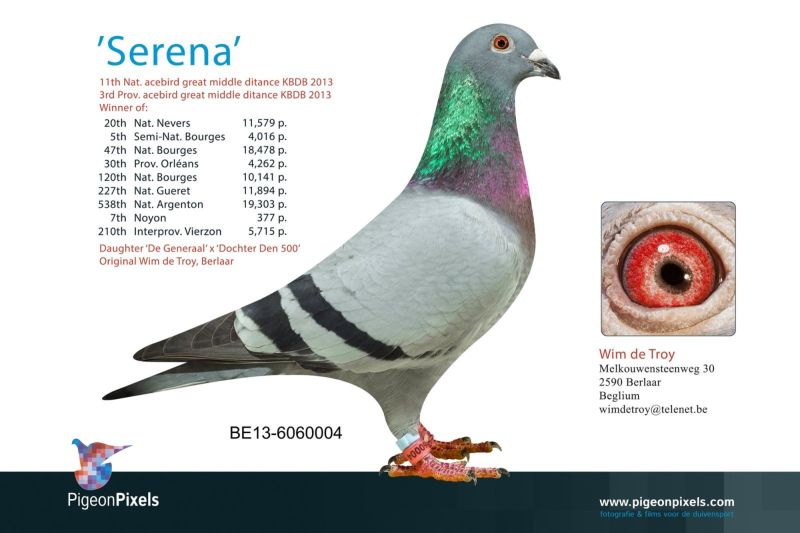 Matka oryg. Wim De Troy. Zwycięzca wielu lotów narodowych w Belgii. Linia Sereny i Herkulesa. Szczegóły pochodzenia w rodowodzie i pod nr tel. 696 241 555