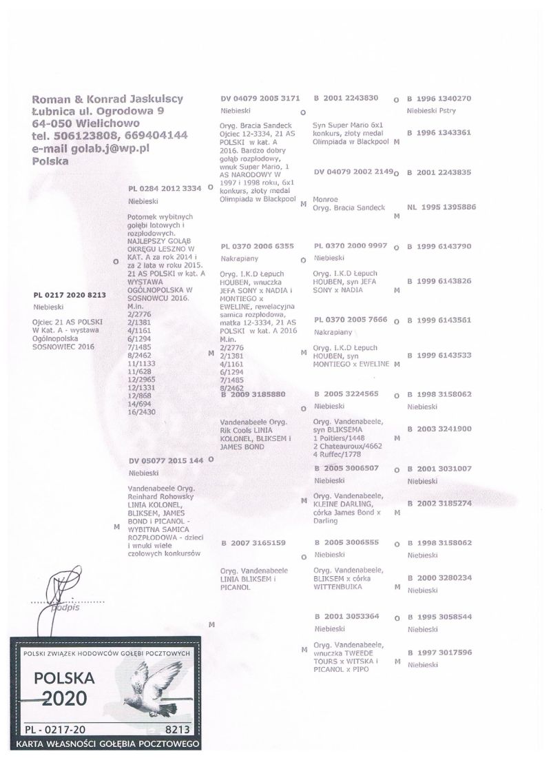 ***** UWAGA !!!!! Możliwy odbiór osobisty lub dostawa realizowana przez kuriera w cenie 160 zł !!!!! Możliwy także odbiór na wystawie Ogólnopolskiej w Katowicach (sobota lub niedziela). UZGODNIENIE TELEFONICZNE !!!!! Oryginalny gołąb z hodowli Romana & Konrada Jaskulskich. Szczegóły pochodzenia w rodowodzie. Gołąb gotowy do sezonu lęgowego, zaszczepiony Columba PHA i Columba RP oraz przeciwko salmonellozie (Salmo PT). Więcej informacji pod nr tel.: 506 123 808. Wpłata za gołębia na konto po zakończeniu aukcji. Możliwy odbiór osobisty lub dostawa realizowana przez kuriera w cenie 160 zł. Możliwy także odbiór na wystawie Ogólnopolskiej w Katowicach (sobota lub niedziela).