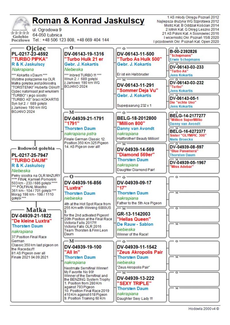 PL-0217-25-7947 *** odbiór m.in. WYSTAWA OGÓLNOPOLSKA *** KOKARTIS x DAUM *** TOP gracze, wybitne LINIE gołębi ***