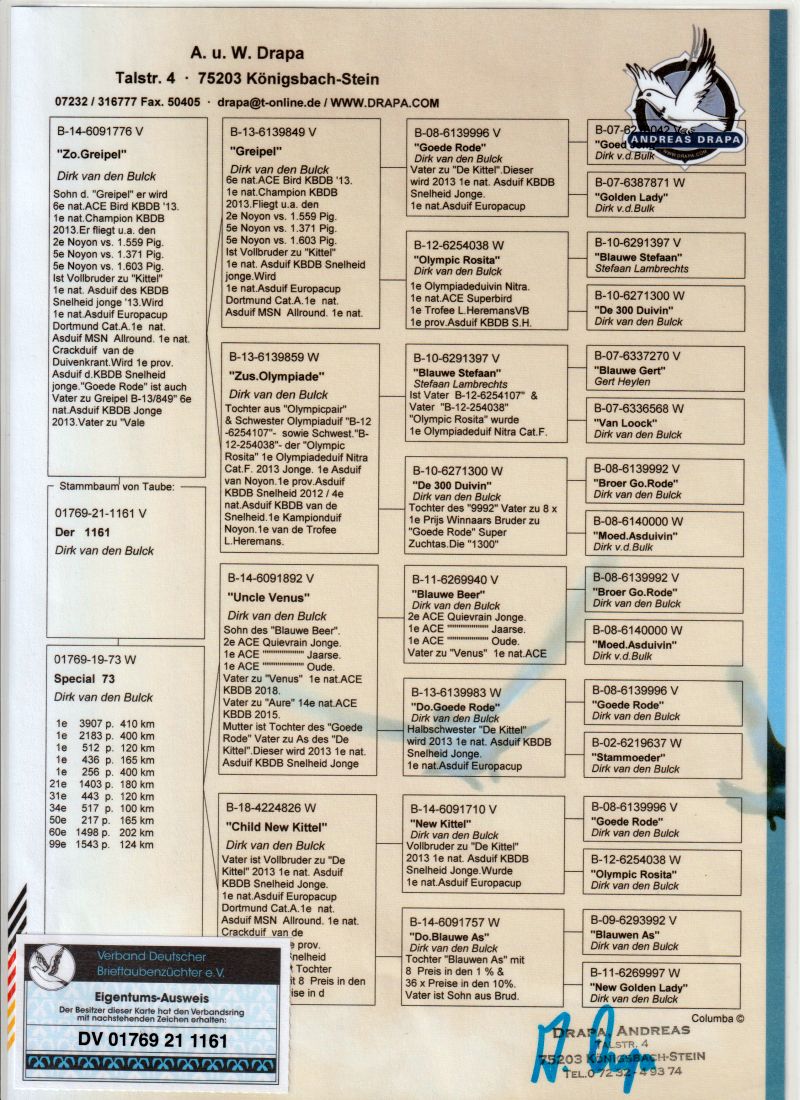 Prezentowane przeze mnie na aukcji gołąbki są zdrowe i w 100% przygotowane do dalszej hodowli. Przedstawiony gołąb to samiec szczegóły pochodzenia gołębia w rodowodzie. Moje wyniki 2025 na szczeblu oddziału. Gołębie dorosłe: Super Mistrzostwo Oddziału - I Vice Mistrz, 5 z 50- II Vice Mistrz, 5 z całości - II Vice Mistrz, Typowane - II Vice Mistrz, KAT. A - I Vice Mistrz, KAT. B - II Przodownik, KAT. C - I Vice Mistrz, KAT. M -I Vice Mistrz, KAT.D - I Vice Mistrz, KAT. GMP - II Vice Mistrz, KAT. ROCZNE - I Vice Mistrz, KAT. ROCZNE COEFF - I Vice Mistrz. Transport prywatnym kurierem kwota ok 150zł pokrywa kupujący. Istnieje również inna forma dostarczenia gołąbka która będzie ustalana indywidualnie z kupującym. Możliwy również odbiór osobisty lub na wystawie Ogólnopolskiej. Więcej informacji na temat gołębi i transportu pod nr tel.663-127-528