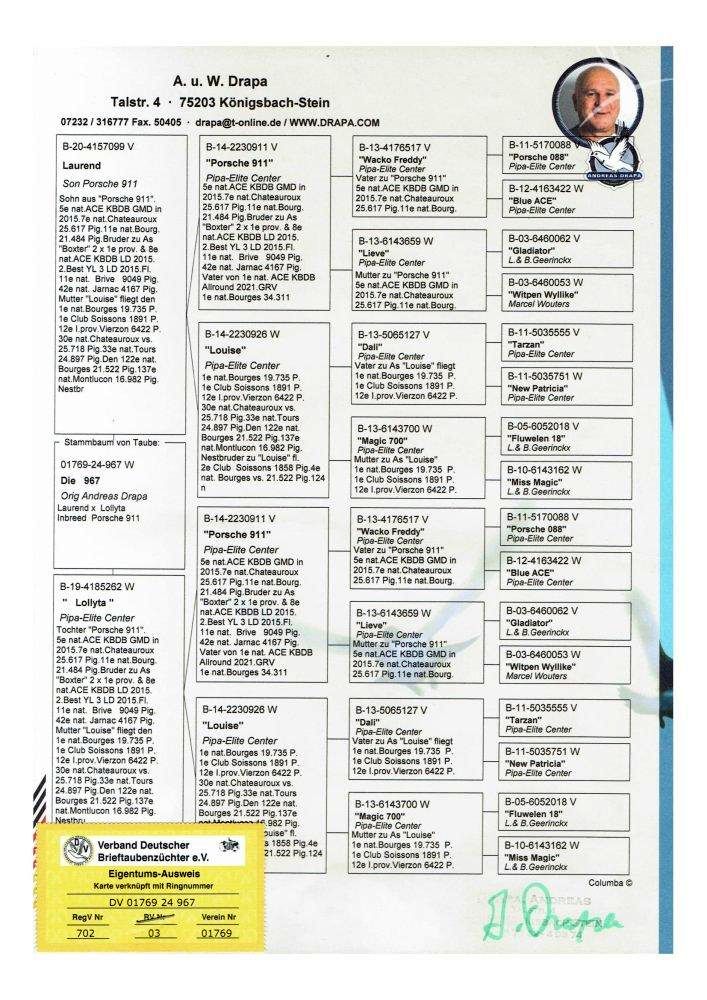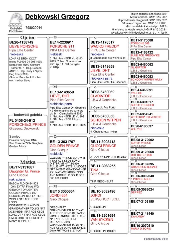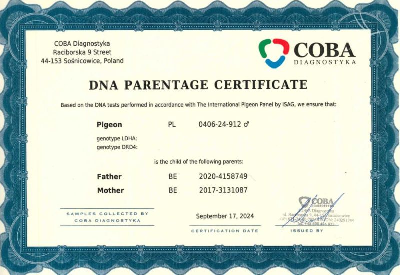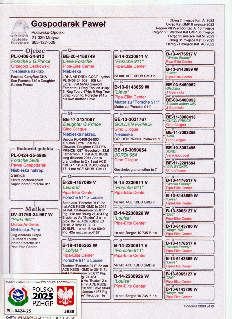 Prezentowane przeze mnie na aukcji gołąbki są zdrowe i w 100% przygotowane do dalszej hodowli. Przedstawiony gołąb to samica szczegóły pochodzenia gołębia w rodowodzie. Moje wyniki 2025 na szczeblu oddziału. Gołębie dorosłe: Super Mistrzostwo Oddziału - I Vice Mistrz, 5 z 50- II Vice Mistrz, 5 z całości - II Vice Mistrz, Typowane - II Vice Mistrz, KAT. A - I Vice Mistrz, KAT. B - II Przodownik, KAT. C - I Vice Mistrz, KAT. M -I Vice Mistrz, KAT.D - I Vice Mistrz, KAT. GMP - II Vice Mistrz, KAT. ROCZNE - I Vice Mistrz, KAT. ROCZNE COEFF - I Vice Mistrz. Transport prywatnym kurierem kwota ok 150zł pokrywa kupujący. Istnieje również inna forma dostarczenia gołąbka która będzie ustalana indywidualnie z kupującym. Możliwy również odbiór osobisty lub na wystawie Ogólnopolskiej. Więcej informacji na temat gołębi i transportu pod nr tel.663-127-528