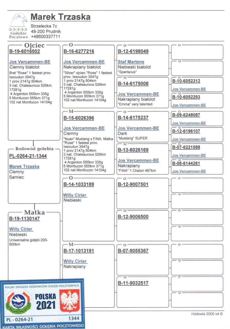 Na aukcji młody gołąb prawdopodobnie pięknie zbudowany samczyk wychowany w celi indywidualnej z połączenia dwóch wybitnych gołębi od Marka Trzaski. Ojciec to gołąb z połączenia gołębi Hok Jos Vercammen na gołębie Willy Cirier, zaś matka jest z połączenia gołębi Hok Jos Vercammen (syn MUSTANG) na gołębie znanego mistrza sportu gołębiarskiego Barta Geerinckxa z jego najlepszych linii. Szczegóły w rodowodzie. Preferowany odbiór osobisty woj. podlaskie, ewentualnie dostawa na wystawię ogólnopolską do Katowic.