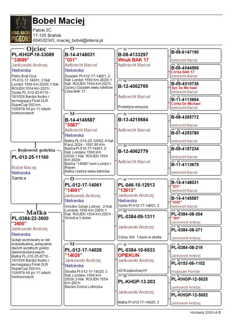 Na aukcji młody gołąb - pięknie zbudowana samiczka wychowany w celi indywidualnej z połączenia dwóch wybitnych gołębi z predyspozycjami do lotów dalekodystansowych. Oboje rodziców pochodzi od kolegi Andrzeja Jankowskiego. Ojciec to lotowany samczyk z połączenia dwóch orginalnych gołebi od Marcela Aelbrechta następnie przeniesiony do rozpłodu, zaś matka jest córką wybitnego samca lotowego "14061" który miał 2 konkurs z Londynu 1566 km w 2020 roku i 1 konkurs z Rouen 1553 km w 2021 roku parowanego na wybitną samicę lotową siostrę z gniazda "14025" który to miał 3 konkurs z Londynu 1566 km w 2020 roku i 3 konkurs Rouen 1553 km w 2021 roku. Jest to pełna siostra PL-012-25-9710, która przeszła cały program lotowy na OLR SuperCup gdzie gołębie były lotowane pod wiatr w sumie 11 lotów w tym 6 lotów powyżej 200 km. Szczegóły w rodowodzie. Preferowany odbiór osobisty woj. podlaskie, ewentualnie dostawa na Wystawę Ogólnopolską do Katowic.