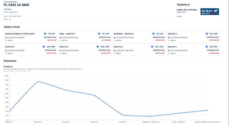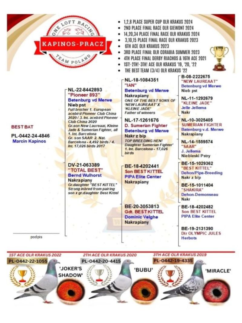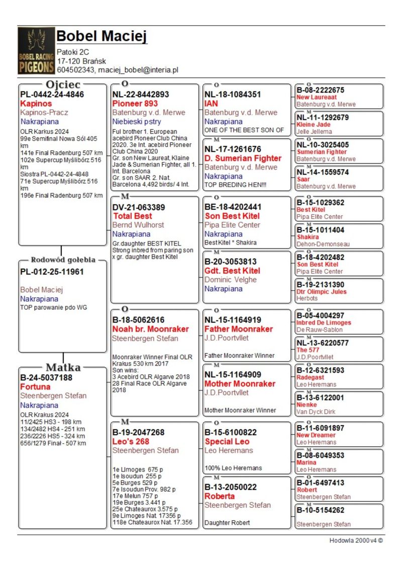 Na aukcji pięknie zbudowany samczyk wychowany w celi indywidualnej z połączenia dwóch wybitnych gołębi po całym programie lotowym na WG Krakus. Ojciec to gołąb z hodowli Kapinos-Pracz, zaś matka z hodowli Stefana Stenbergena. Szczegóły w rodowodzie. Preferowany odbiór osobisty woj. podlaskie, ewentualnie dostawa na Wystawę Ogólnopolską do Katowic.