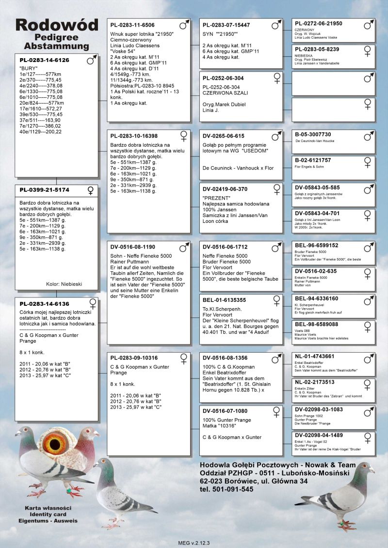 Oryginalny gołąb z hodowli Nowak & Team, szczegóły pochodzenia, rodowód poniżej. Transport gołębi prywatnym transportem.