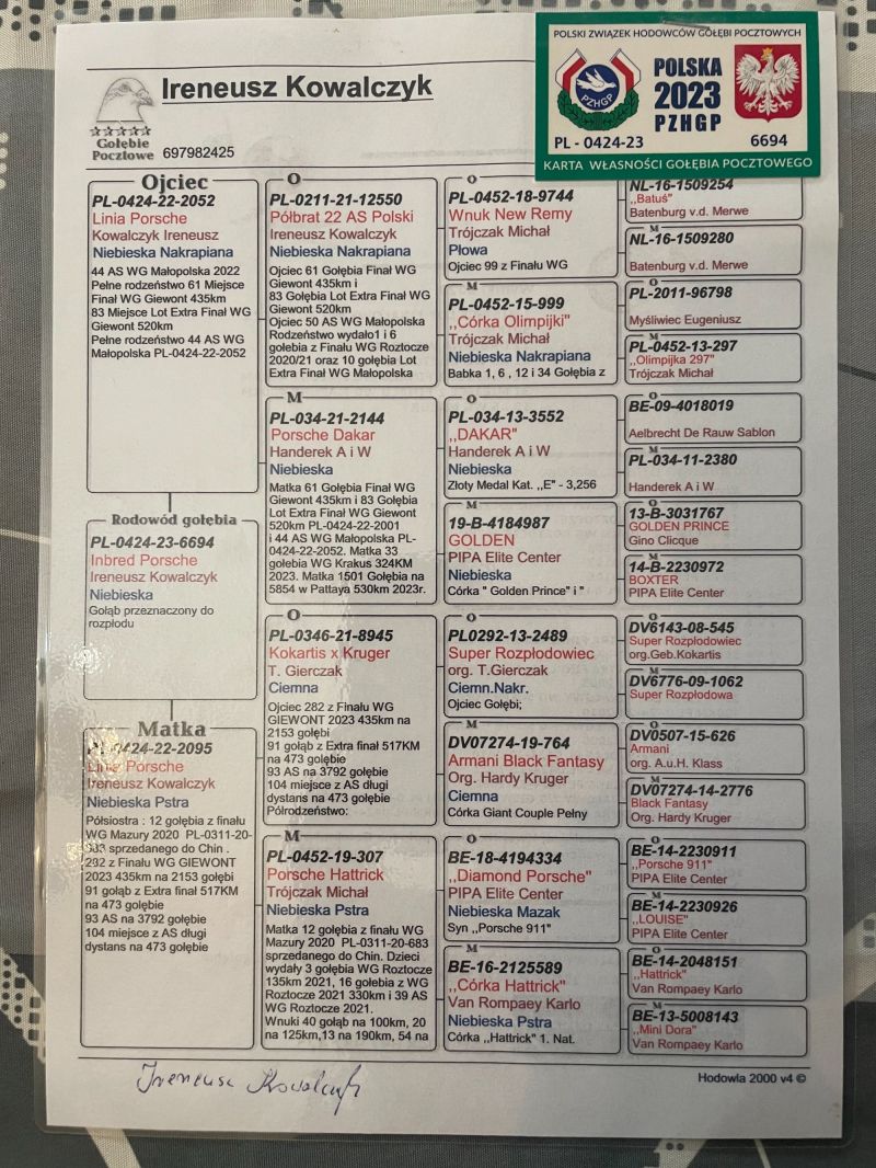 Oryginalny gołąb z hodowli Ireneusz Kowalczyk - Wnuk "Dakar" - Złoty Medal kat. "E" x Wnuczka "Diamond Porsche" Szczegóły pochodzenia w rodowodzie. Gołębie po kuracji przygotowane do lęgów. Więcej informacji pod numerem telefonu: 667 324 002 - Transport prywatnym kurierem, odbiór na wystawie ogólnopolskiej lub odbiór osobisty.