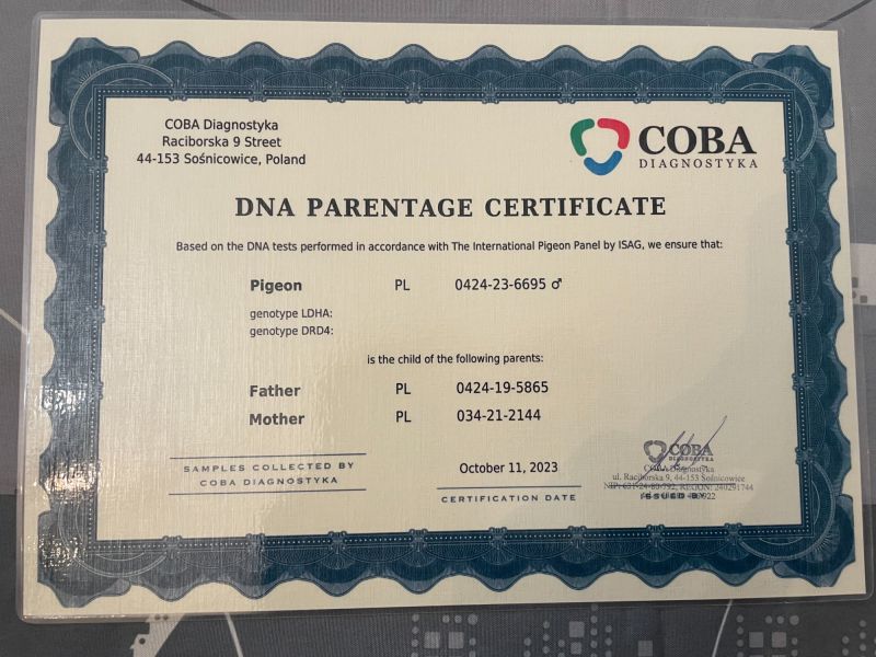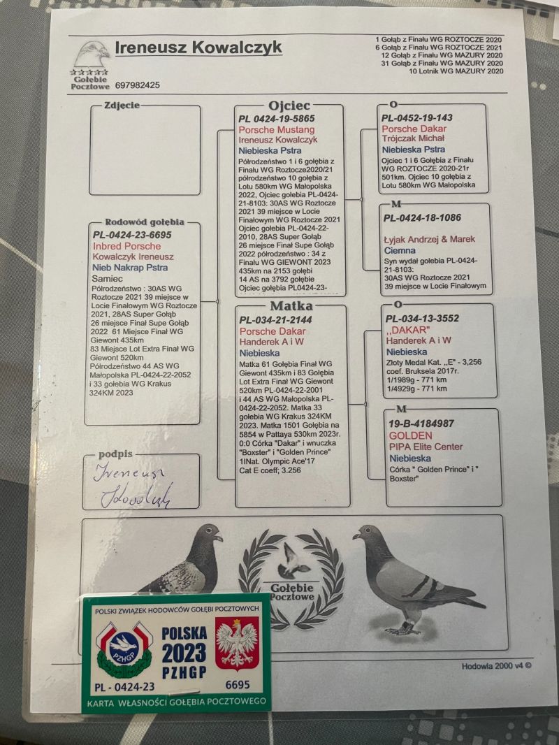 Oryginalny gołąb z hodowli Ireneusz Kowalczyk - Porsche Mustang x Porsche Dakar - CERTYFIKAT DNA!!!!